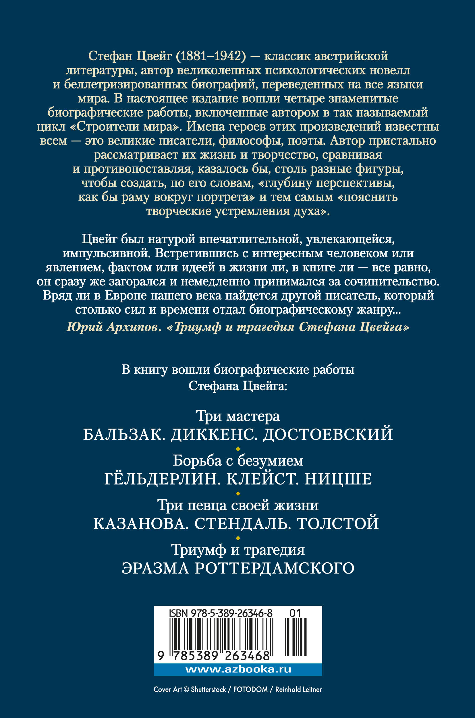 Стефан Цвейг - классик австрийской литературы, автор великолепных психологических новелл и беллетризированных биографий, переведенных на все языки мира. Его биографии сочетают в себе художественные достоинства и верность документальным источникам, при этом Цвейг неизменно выбирал для своих книг людей необыкновенных, наделенных высокими талантами и оставивших в истории неизгладимый, часто трагический след. В настоящее издание вошли четыре знаменитые биографические работы Стефана Цвейга, включенные автором в так называемый цикл "Строители мира". Имена героев этих произведений известны всем - это великие писатели, философы, поэты. Автор пристально рассматривает их жизнь и творчество, сравнивая и противопоставляя, казалось бы, столь разные фигуры, чтобы создать, по его словам, "глубину перспективы, как бы раму вокруг портрета" и тем самым "пояснить творческие устремления духа".| Издательство | Азбука-Аттикус Издат.группа ООО |