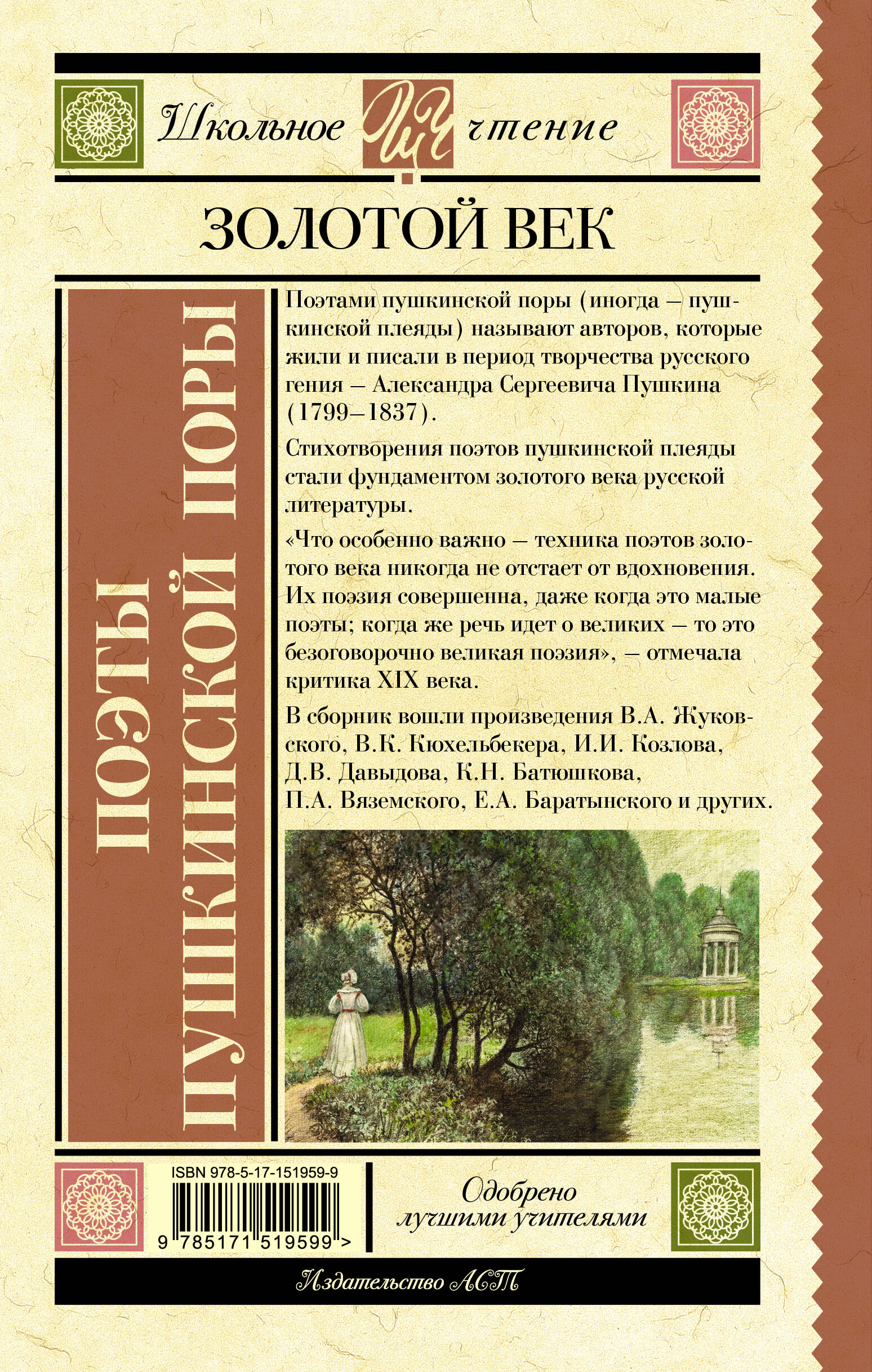 Поэтами пушкинской поры (иногда - пушкинской плеяды) называют авторов, которые жили и писали в период творчества русского гения - Александра Сергеевича Пушкина (1799-1837). Стихотворения поэтов пушкинской плеяды стали фундаментом золотого века русской литературы. "Что особенно важно - техника поэтов золотого века никогда не отстает от вдохновения. Их поэзия совершенна, даже когда это малые поэты; когда же речь идет о великих- то это, безоговорочно, великая поэзия" - отмечала критика XIX века. В сборник вошли произведения В. Жуковского В.А., Кюхельбекера В.К., Козлова И.И., Давыдова Д.В., Батюшкова К.Н., Вяземского П.А., Баратынского Е.А. и других.