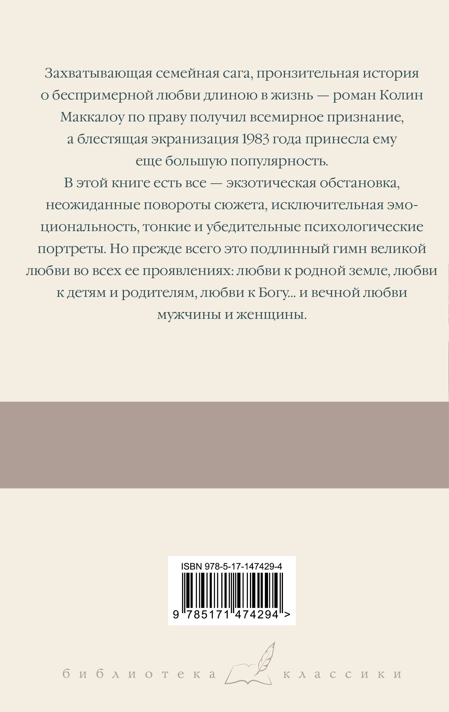 Захватывающая семейная сага, пронзительная история о беспримерной любви длиною в жизнь - роман Колин Маккалоу по праву получил всемирное признание, а блестящая экранизация 1983 года принесла ему еще большую популярность. В этой книге есть все - экзотическая обстановка, неожиданные повороты сюжета, исключительная эмоциональность, тонкие и убедительные психологические портреты. Но прежде всего это подлинный гимн великой любви, во всех ее проявлениях: любви к родной земле, любви к детям и родителям, любви к Богу… и вечной любви мужчины и женщины.| Издательство | АСТ |