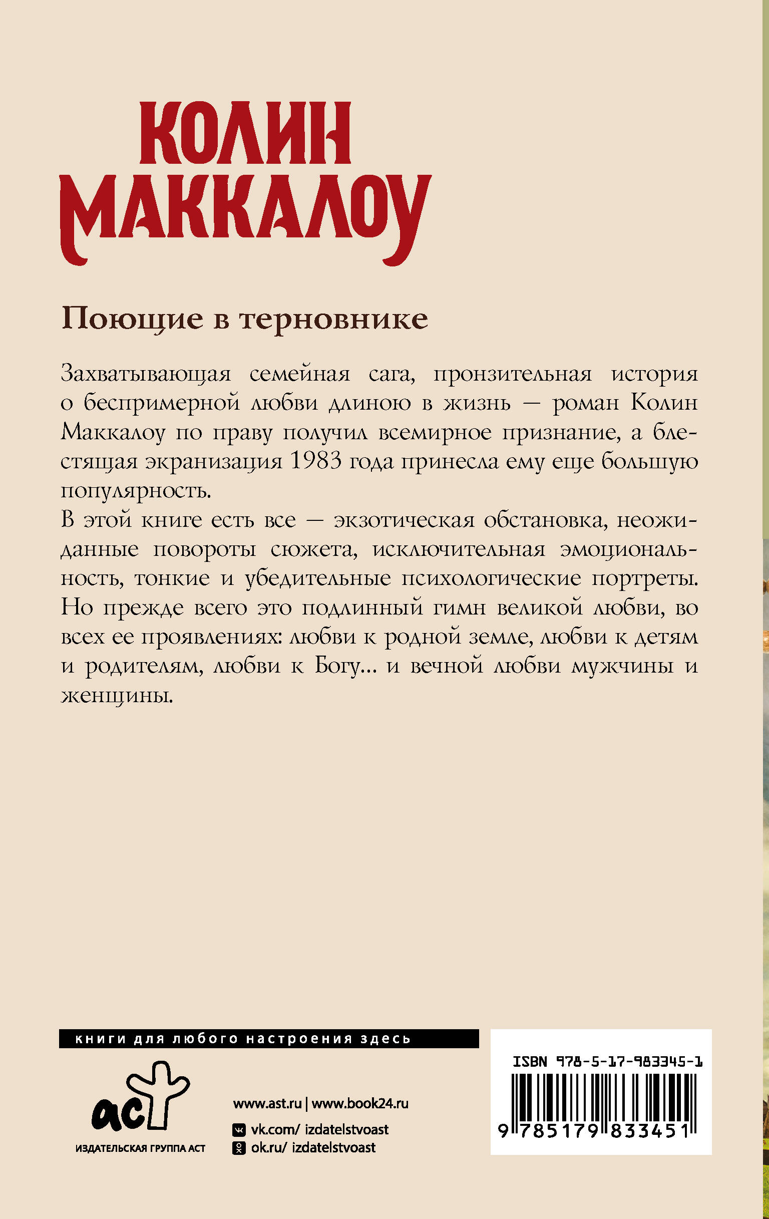 Захватывающая семейная сага, пронзительная история о беспримерной любви длиною в жизнь - роман Колин Маккалоу по праву получил всемирное признание, а блестящая экранизация 1983 года принесла ему еще большую популярность. В этой книге есть все - экзотическая обстановка, неожиданные повороты сюжета, исключительная эмоциональность, тонкие и убедительные психологические портреты. Но прежде всего это подлинный гимн великой любви, во всех ее проявлениях: любви к родной земле, любви к детям и родителям, любви к Богу… и вечной любви мужчины и женщины.| Издательство | ИЗДАТЕЛЬСТВО "АСТ" |