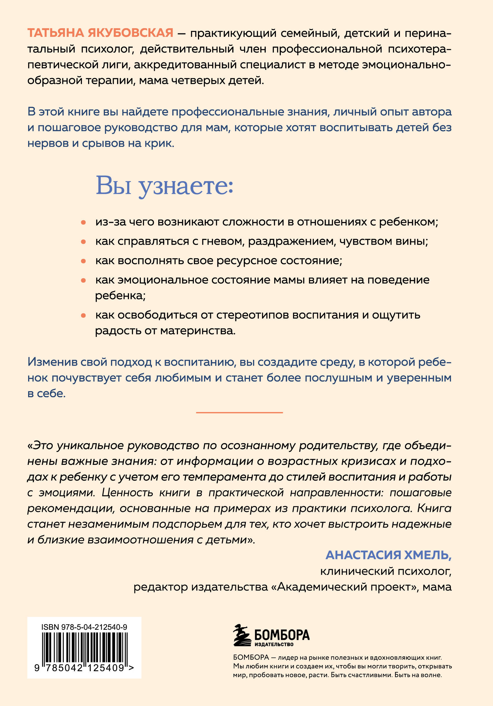 Ребенок не слушается, капризничает, закатывает истерики? Подросток грубит, проявляет агрессию? Вы мама и обеспокоены таким поведением? Раздражаетесь, нервничаете, от бессилия срываетесь на крик, а потом испытываете чувство вины? Тогда эта книга точно для вас. Татьяна Якубовская - мама четверых детей, практикующий семейный, детский и перинатальный психолог, действительный член профессиональной психотерапевтической лиги - дает конкретные шаги, как выйти из круга напряженного материнства и обрести спокойствие. Эта книга - практическое руководство, с помощью которого за 4 недели вы: - поймете, из-за чего возникают сложности в отношениях с ребенком; - получите практические навыки, чтобы справляться с гневом, раздражением, чувством вины и страхами; - узнаете, как восполнять свое ресурсное состояние; - научитесь понимать и чувствовать ребенка; - освободитесь от стереотипов воспитания и ощутите, что материнство - это удовольствие.| Издательство | ООО "Издательство "Эксмо" |