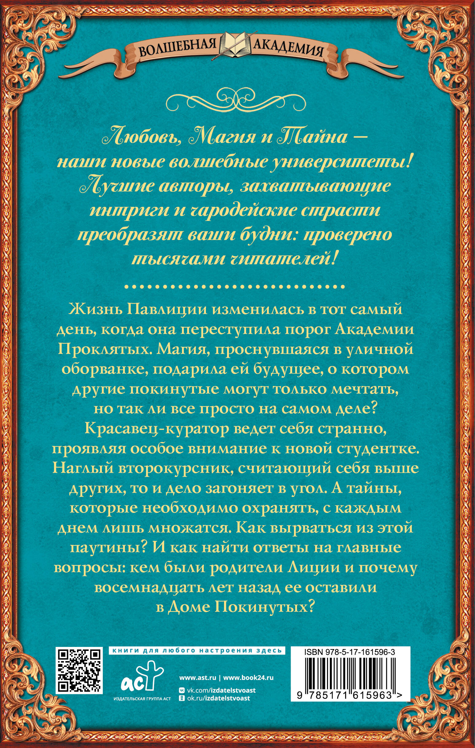 Жизнь Павлиции изменилась в тот самый день, когда она переступила порог Академии Проклятых. Магия, проснувшаяся в уличной оборванке, подарила ей будущее, о котором другие покинутые могут только мечтать, но так ли все просто на самом деле? Красавец-куратор ведет себя странно, проявляя особое внимание к новой студентке. Наглый второкурсник, считающий себя выше других, то и дело загоняет в угол. А тайны, которые необходимо охранять, с каждым днем только множатся. Как вырваться из этой паутины? И как узнать ответы на главные вопросы: кем были родители Лиции и почему восемнадцать лет назад они оставили ее в Доме Покинутых?| Издательство | Издательство "АСТ" |