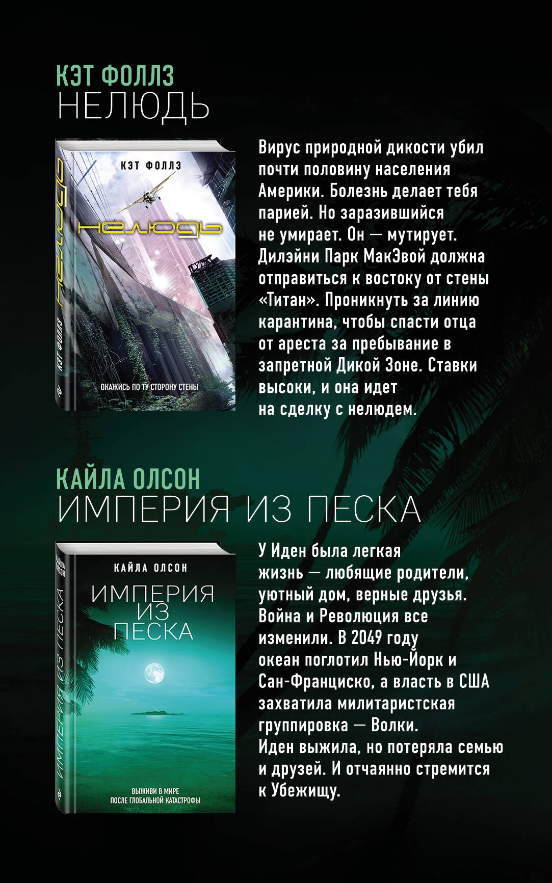 Комплект из 2-х книг: Империя из песка, Нелюдь Кэт Фоллз Нелюдь Вирус природной дикости убил почти половину населения Америки. Болезнь делает тебя парией. Но заразившийся не умирает. Он - мутирует. Дилэйни Парк МакЭвой должна отправиться к Востоку от стены "Титан". Проникнуть за линию карантина, чтобы спасти отца от ареста за пребывание в запретной Дикой Зоне. Ставки высоки, и она идет на сделку с нелюдем. Кайла Олсон Империя из песка У Иден была легкая жизнь - любящие родители, уютный дом, верные друзья. Война и Революция все изменили. В 2049 году океан поглотил Нью-Йорк и Сан-Франциско, а власть в США захватила милитаристская группировка - Волки. Иден выжила, но потеряла семью и друзей. И отчаянно стремится к Убежищу.| Издательство | ООО "Издательство "Эксмо" |