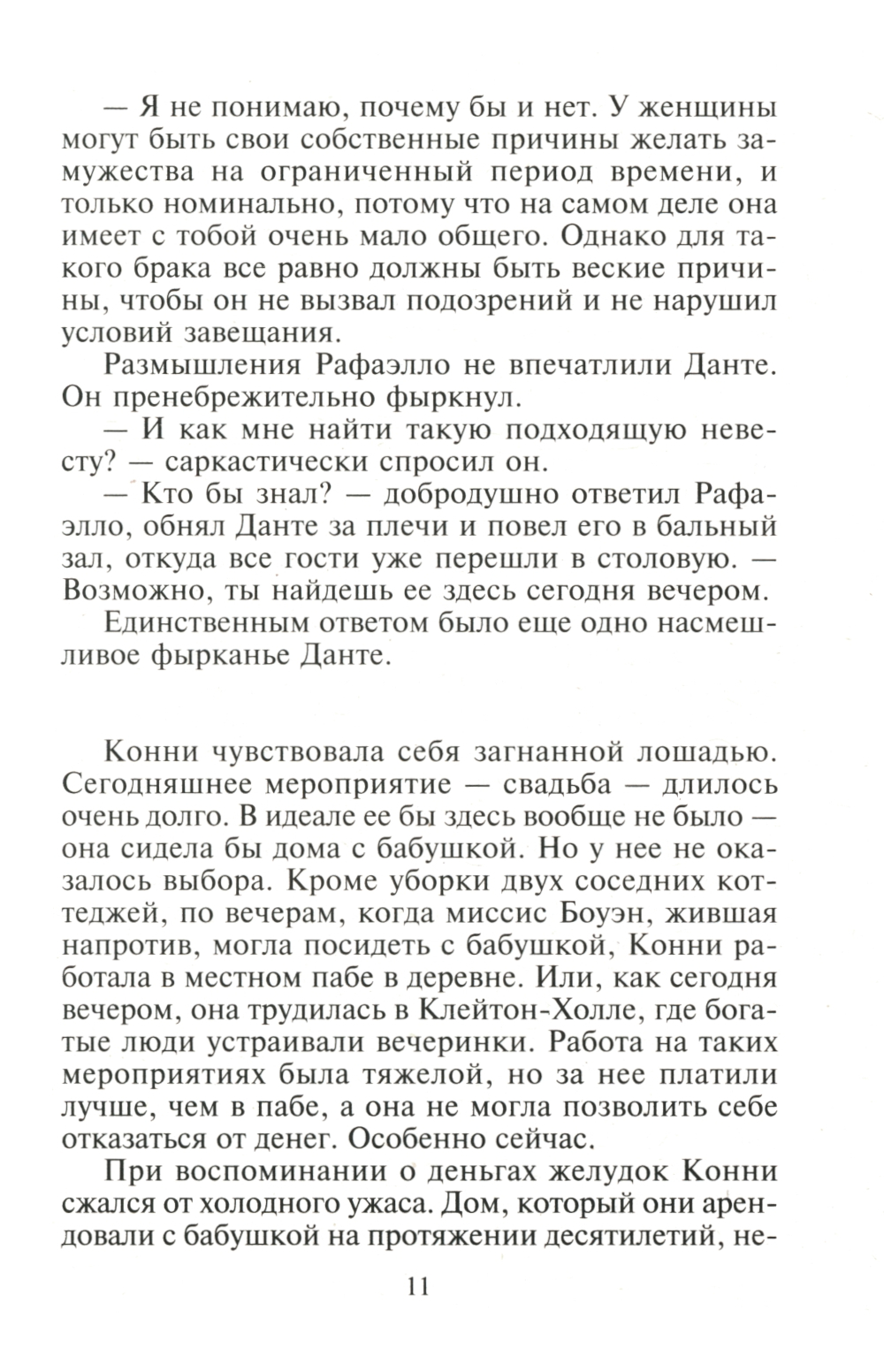 Конни лихорадочно искала выход из трудного положения: за бабушкой нужен постоянный уход, хозяин арендованного дома требует, чтобы женщины съехали, а куда? Тех денег, что девушка зарабатывает, слишком мало для поиска нового жилья. И тут появляется богатый красавец и предлагает ей сделку - фиктивный брак. По завещанию деда он должен срочно жениться, иначе не получит огромное наследство. Брак должен продлиться не менее полутора лет, за это Конни и ее бабушка будут полностью обеспечены, а затем развод. Конни согласилась. Молодые люди не представляли, на какой скользкий путь они вступают…