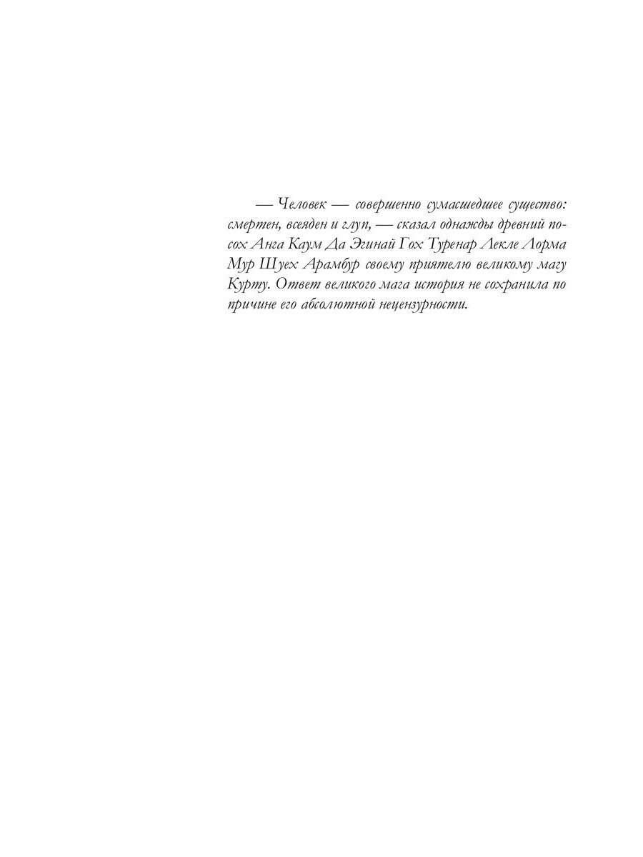 - Человек - совершенно сумасшедшее существо: смертен, всеяден и глуп, - сказал однажды древний посох Анга Каум Да Эгинай Гох Туренар Лекле Лорма Мур Шуех Арамбур своему приятелю великому магу Курту. Ответ великого мага история не сохранила по причине его абсолютной нецензурности.| Издательство | Т8 RUGRAM |