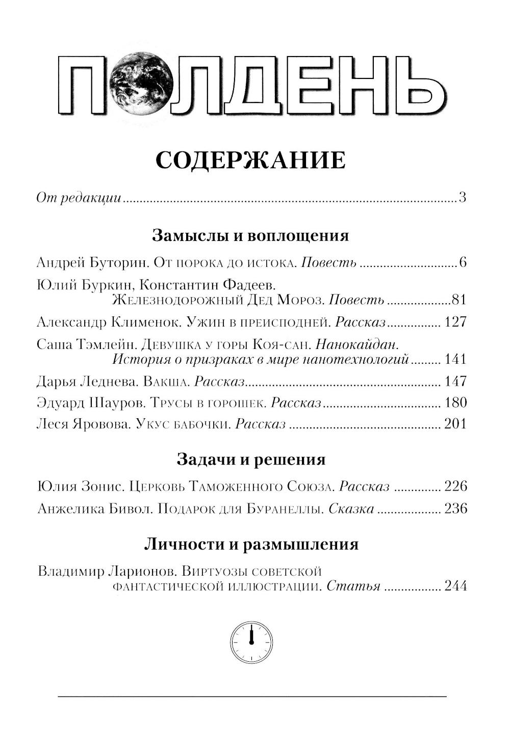 Альманах «Полдень» продолжает традиции журнала «Полдень. XXI век», главным редактором которого был мэтр отечественной фантастики Борис Стругацкий. В альманахе печатаются повести и рассказы, а также статьи, посвященные вероятному будущему, а также историческому анализу и современной ситуации в отечественной фантастической литературе.| Издательство | Изд. Сидорович |