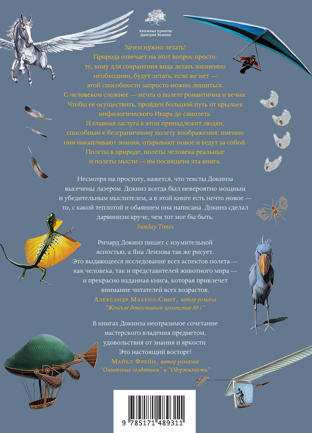Выдающийся биолог и научный журналист Ричард Докинз рассказывает обо всех видах полета - мысленного и реального. Люди не летают как птицы, но всегда этого очень хотели, поэтому лучшие умы столетиями придумывали и (часто с риском для жизни) испытывали способы покорения воздушной стихии и победы над гравитацией. Самое важное и парадоксальное в том, что сначала человек взлетает мысленно - в своей неуемной фантазии. Эта сверхспособность отличает его от природы и рациональных сил эволюции. Знаменитый Ричард Докинз зовет нас в мир таких людей и готов стать нашим проводником. Птицы, многие насекомые и даже некоторые млекопитающие летают потому, что это необходимо ради сохранения и продолжения вида. Способов полета и приемов адаптации к нему множество, и для каждого вида природа подберет свой - все они описаны в книге со множеством примеров. Докинз - влиятельнейшая фигура в мире научной журналистики и научно-популярной литературы. Среди важнейших работ автора "Эгоистичный ген", "Перерастая бога", "Расширенный фенотип", "Магия реальности", "Рассказ предка", "Огарок во тьме". В издании множество цветных иллюстраций, выполненных словацкой художницей Яной Лензовой. Книга абсолютно универсальна: это увлекательное чтение, прекрасный подарок, идеальный вариант для совместного досуга с детьми школьного возраста и пополнение коллекции работ Докинза, ибо "в этой книге есть нечто новое ― то, с какой теплотой и обаянием она написана" (Sunday Times).| Издательство | ИЗДАТЕЛЬСТВО "АСТ" |