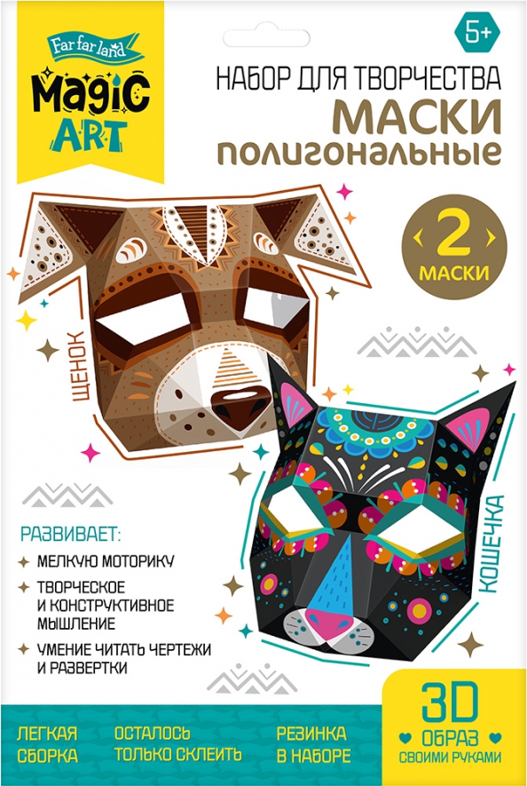 Перед вами - набор для творчества по созданию двух объемных масок: кошечки и щенка. Сборка масок проста и не требует специальной подготовки. Вам необходимо лишь склеить ее и продеть резинку.