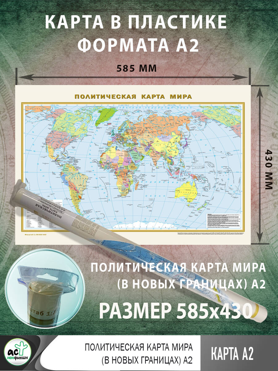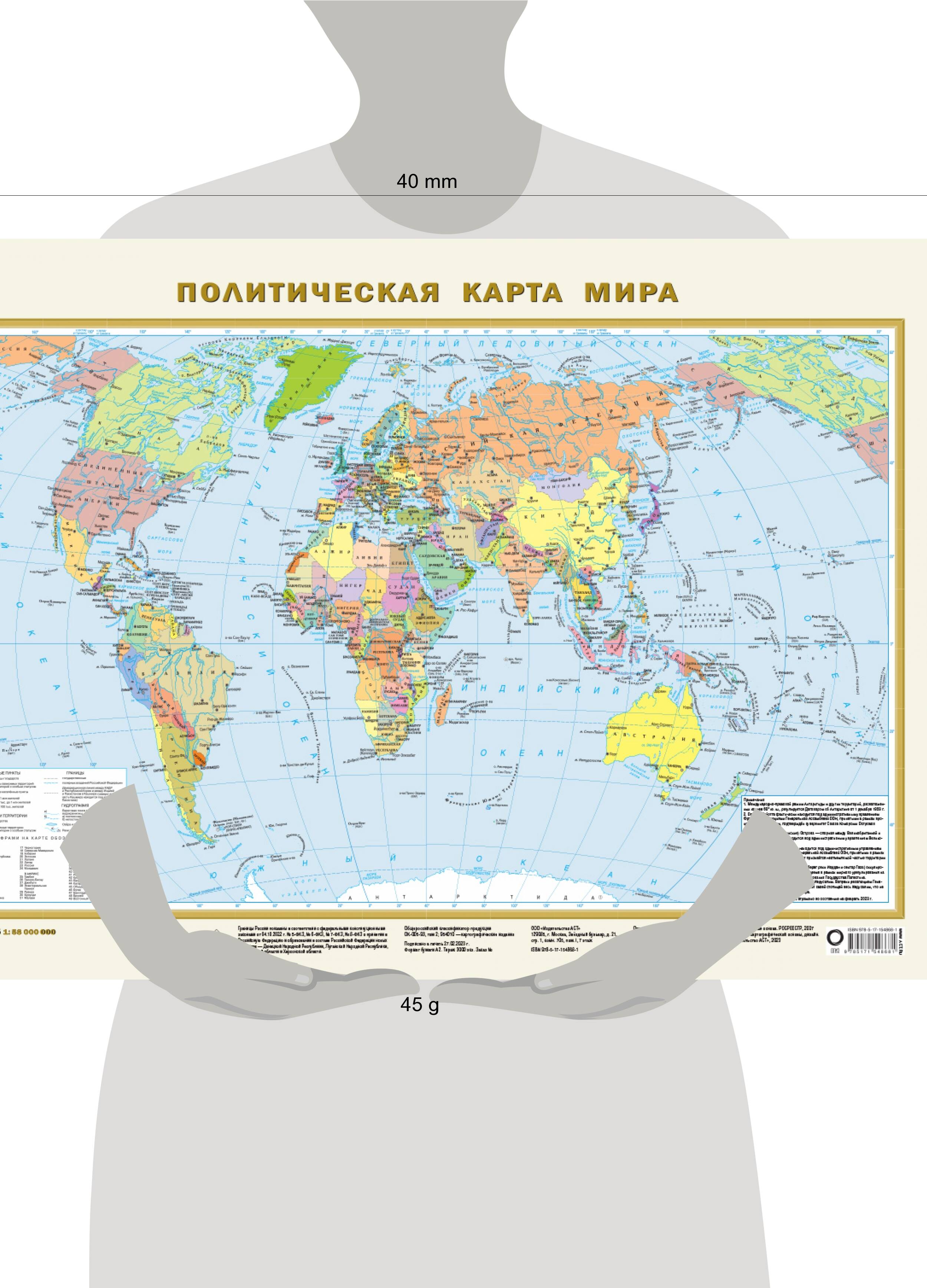 Политическая карта мира имеет размеры 575х420 мм и с лицевой стороны покрыта полимерной плёнкой. На карте масштаба 1:58 000 000 (в 1 см 580 км) яркими контрастными цветами показаны все независимые государства мира с их столицами, а также владения и территории с особым статусом. Россия представлена в новых границах: с Донецкой и Луганской Народными республиками, Запорожской и Херсонской областями, Республикой Крым и Севастополем. Населённые пункты на карте даны в трёх градациях численности: более 1 млн жителей, от 100 тыс. до 1 млн, менее 100 тыс. жителей. Карта упакована в прозрачный рукав из ПВХ. Размеры упаковки: длина 420 мм, диаметр 45 мм| Издательство | ИЗДАТЕЛЬСТВО "АСТ" |