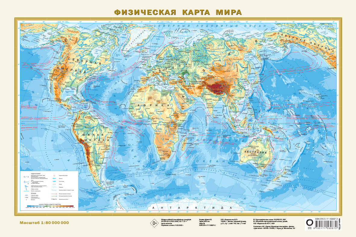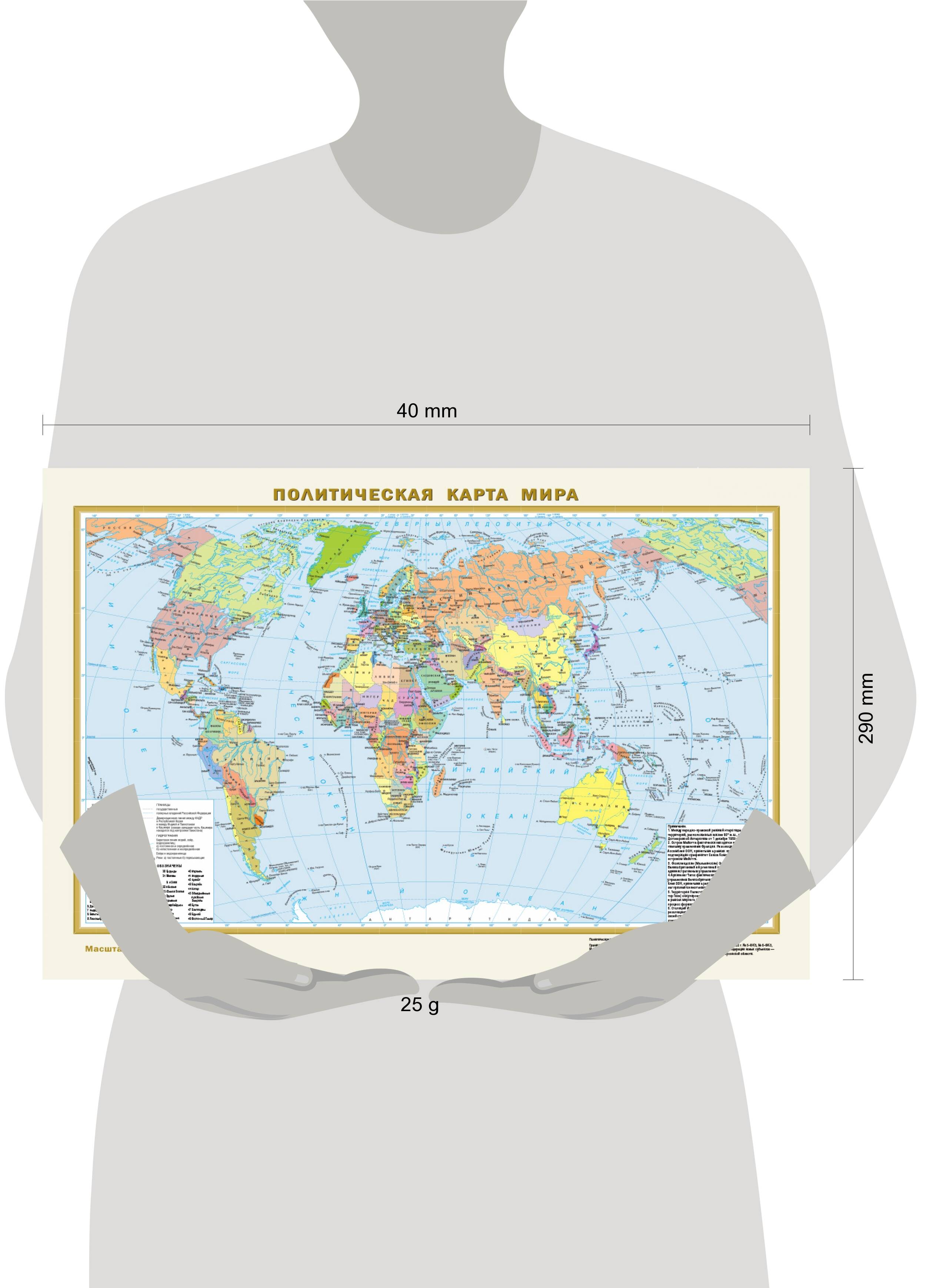 Эта настольная карта, покрытая с обеих сторон полимерной плёнкой, имеет размеры 440х290 мм. Она состоит из двух карт одинакового масштаба 1:80 000 000 (в 1 см 800 км). Физическая карта мира наглядно отражает распределение горного, равнинного и производных типов рельефа по поверхности суши Земли. Пунсонами с высотными отметками показаны высочайшие вершины всех континентов и основных горных систем. Объекты гидрологической сети на карте включают все наиболее крупные реки с притоками и озёра. Представлен также рельеф дна Мирового океана с выделением хребтов, котловин и глубоководных желобов с их наибольшими глубинами. В океанах показаны тёплые и холодные течения. На Политической карте показаны все независимые государства мира с их столицами, а также зависимые территории и территории с особым статусом. Россия представлена в новых границах: с Донецкой и Луганской Народными республиками, Запорожской и Херсонской областями, Республикой Крым и Севастополем. Населённые пункты на карте даны в трёх градациях численности: более 1 млн жителей, от 100 тыс. до 1 млн, менее 100 тыс. жителей. Карта с обеих сторон покрыта антибликовым покрытием и и упакована в прозрачный полиэтиленовый рукав длиной 290 мм и диаметром 40 мм.| Издательство | ИЗДАТЕЛЬСТВО "АСТ" |