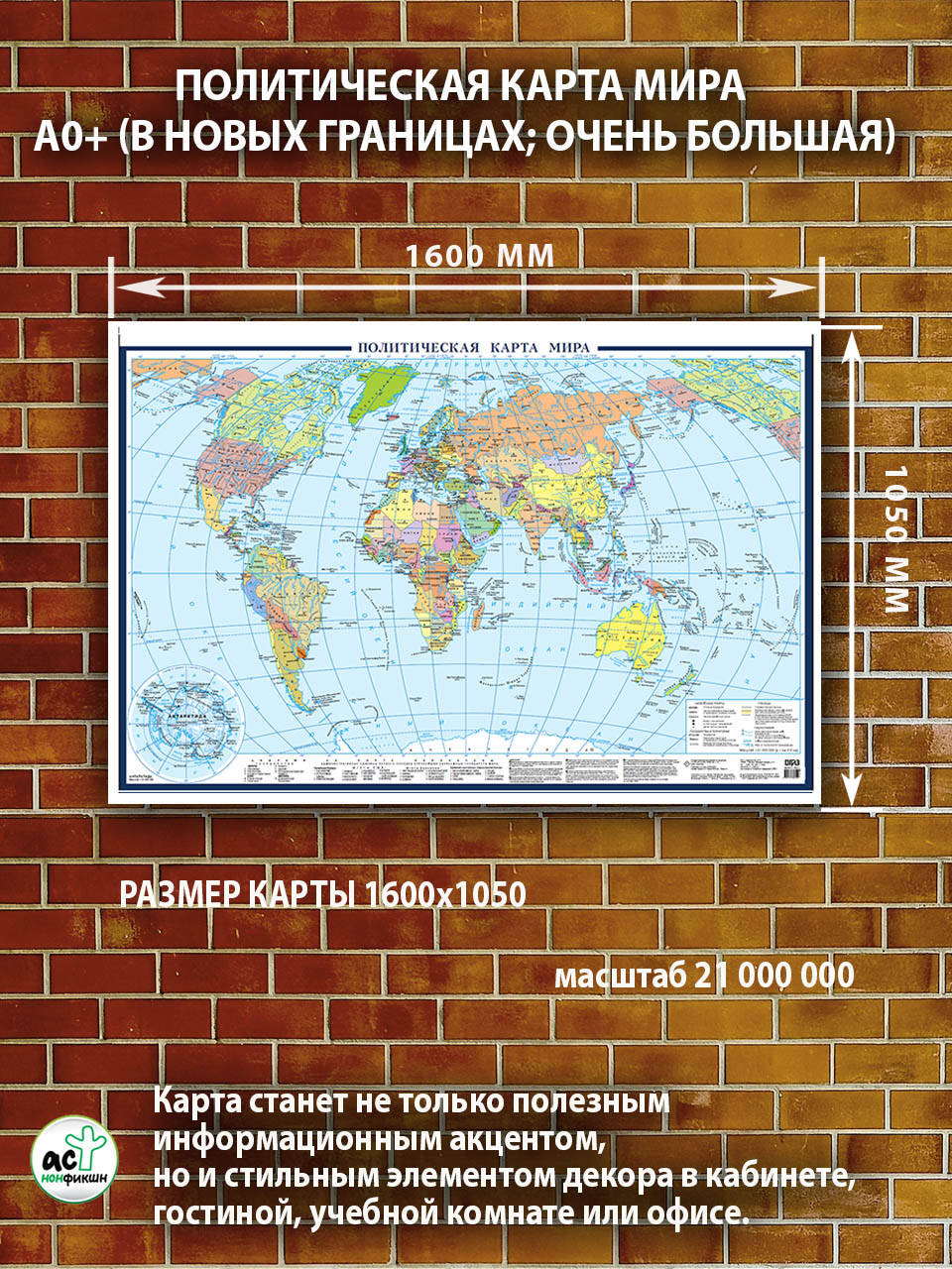 Политическая карта мира. "Политическая карта мира" масштаба 1:21 000 000 (в 1 см 210 км). На карте мира выделены государства, владения и территории с особым статусом, даны их государственные границы. Населённые пункты на карте даны в трех градациях столицы государств, центры зависимых территорий и территорий с особым статусом, прочие населенные пункты. Рекомендовано для широкого круга пользователей.| Издательство | Издательство "АСТ" |