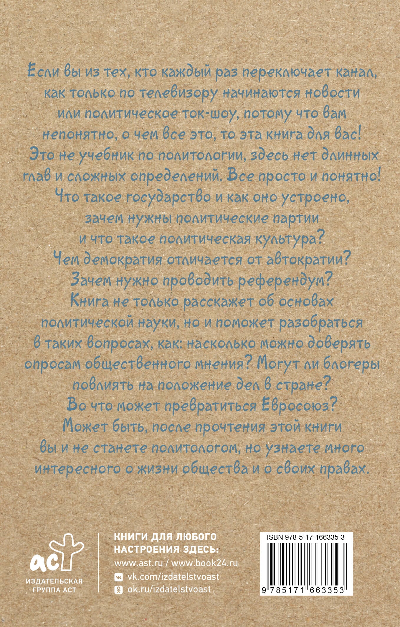 Если вы из тех, кто каждый раз переключает канал, как только по телевизору начинаются новости или политическое ток-шоу, потому что вам непонятно, о чём всё это, то эта книга для вас! Это не учебник по политологии, здесь нет длинных глав и сложных определений. Все просто и понятно! Что такое государство и как оно устроено, зачем нужны политические партии и что такое политическая культура? Чем демократия отличается от автократии? Зачем нужно проводить референдум? Книга не только расскажет об основах политической науки, но и поможет разобраться в таких вопросах, как: насколько можно доверять опросам общественного мнения, могут ли блогеры повлиять на положение дел в стране, во что может превратиться Евросоюз? Может быть, после прочтения этой книги вы и не станете политологом, но узнаете много интересного о жизни общества и о своих правах.| Издательство | Издательство "АСТ" |