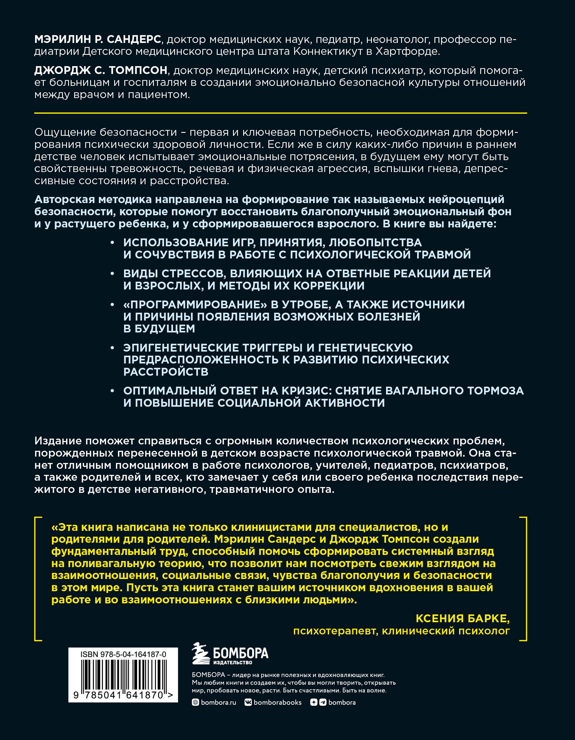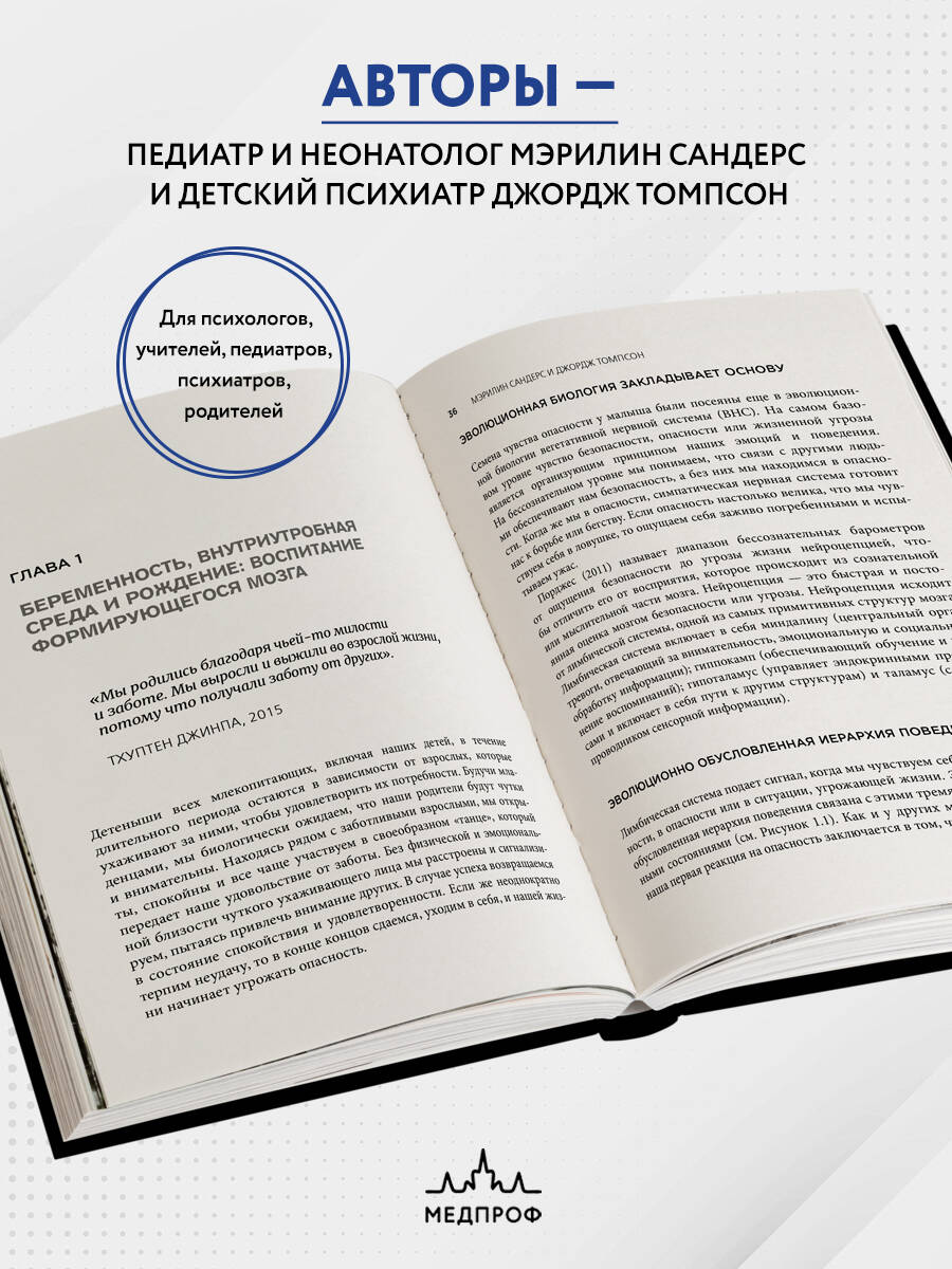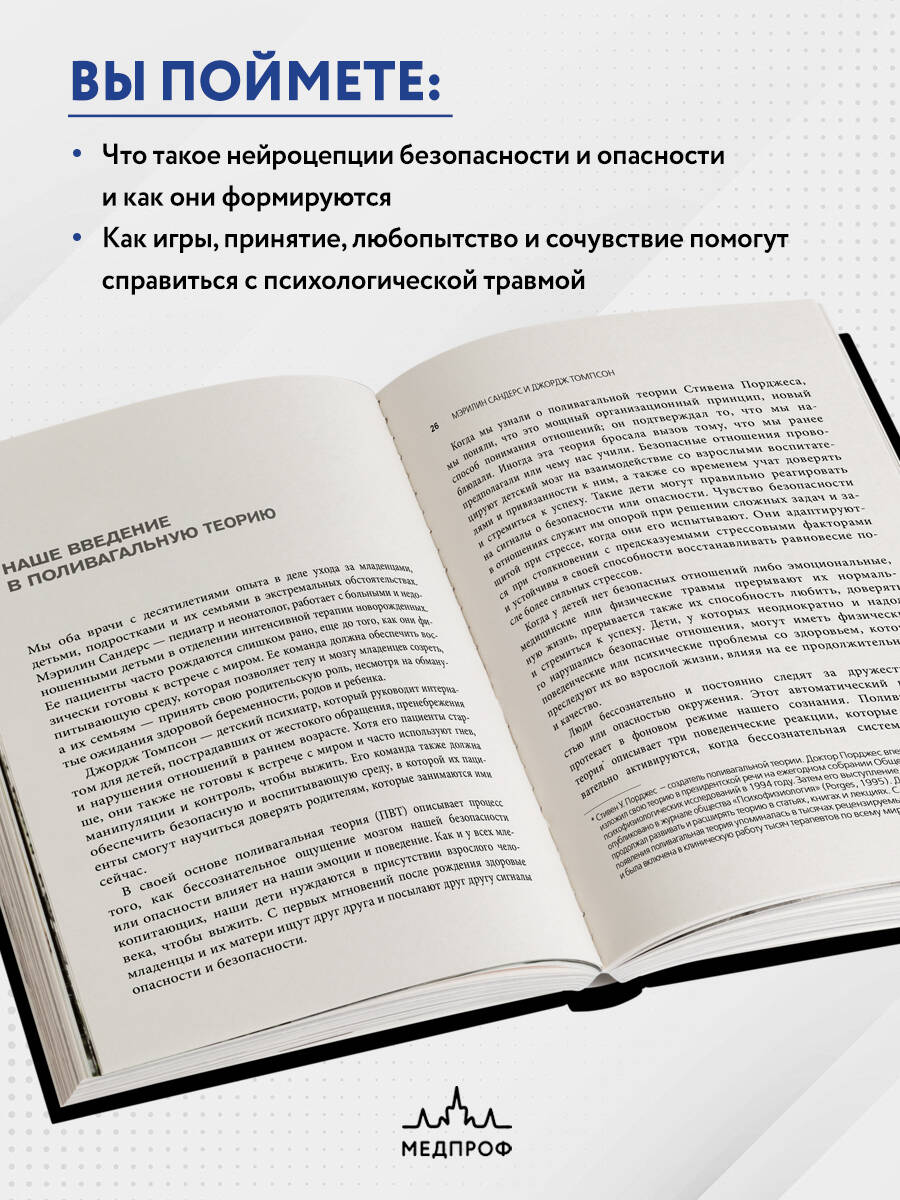 Когда дети не чувствуют себя в безопасности или подвержены хроническому воздействию эмоциональных, физических либо медицинских травм (к примеру, «доращивание» недоношенных детей в специальных кювезах или операции в младенческом возрасте), у них формируются нарушения в способности строить близкие гармоничные отношения в будущем, могут возникать проблемы с поведением и физическим развитием. Поливагальная теория описывает, как бессознательное чувство безопасности или опасности в младенческом возрасте влияет на наши будущие эмоции и поведение. Педиатр и неонатолог Мэрилин Сандерс и детский психиатр Джордж Томпсон рассказывают, как родители, воспитатели и психологи могут прорабатывать детские травмы и не допускать их развития в будущем. Кроме того, вы поймете: - как помочь ребенку пережить физическую или эмоциональную травму; - что такое нейроцепции безопасности и опасности и как они формируются; - чем может помочь поливагальная теория в обычной жизни.