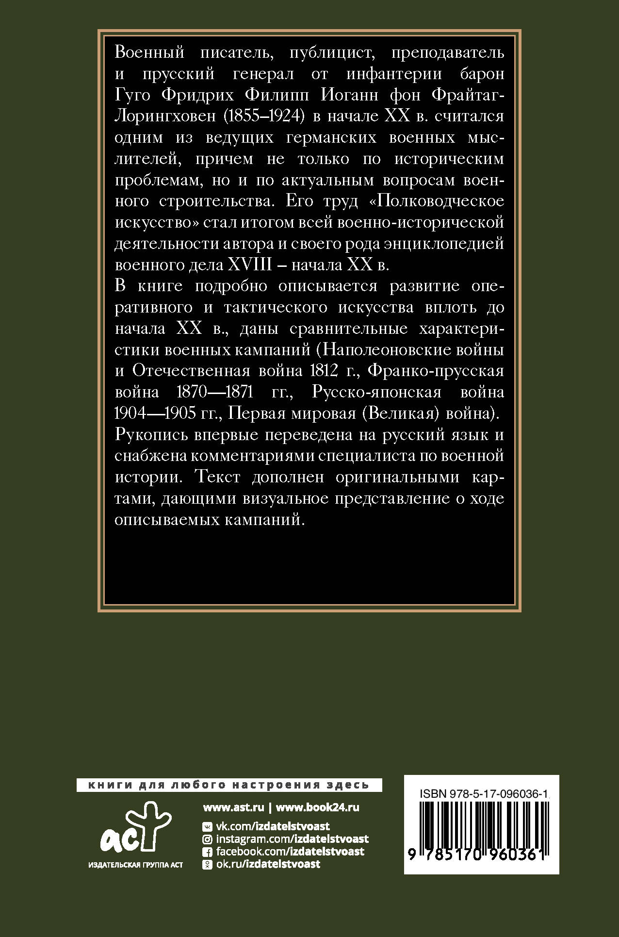Военный писатель, публицист, преподаватель и прусский генерал от инфантерии барон Гуго Фридрих Филипп Иоганн фон Фрайтаг-Лорингховен (1855-1924) в начале ХХ в. считался одним из ведущих германских военных мыслителей, причем не только по историческим проблемам, но и по актуальным вопросам военного строительства. Его труд "Полководческое искусство" стал итогом всей военно-исторической деятельности автора и своего рода энциклопедией военного дела XVIII - начала XX в. В книге подробно описывается развитие оперативного и тактического искусства вплоть до начала ХХ в., даны сравнительные характеристики военных кампаний (Наполеоновские войны и Отечественная война 1812 г., Франко-прусская война 1870-1871 гг., Русско-японская война 1904-1905 гг., Первая мировая (Великая) война). Рукопись впервые переведена на русский язык и снабжена комментариями специалиста по военной истории. Текст дополнен оригинальными картами, дающими визуальное представление о ходе описываемых кампаний.| Издательство | ИЗДАТЕЛЬСТВО "АСТ" |