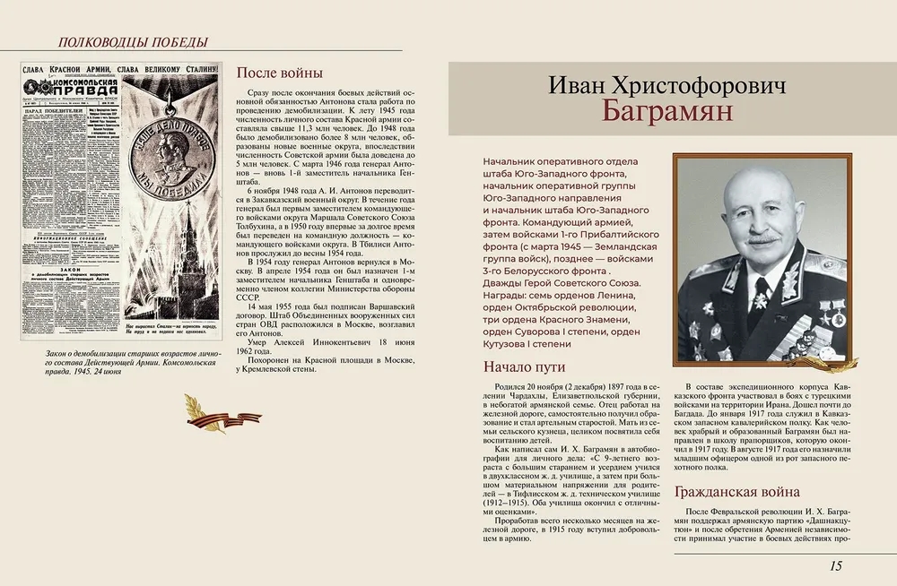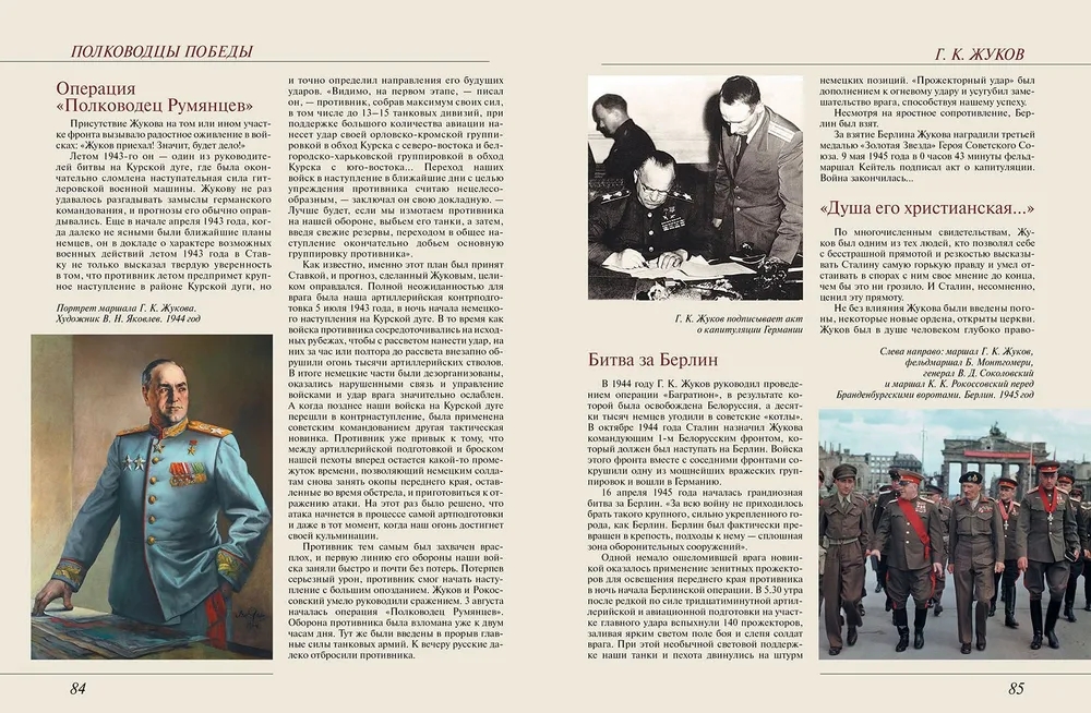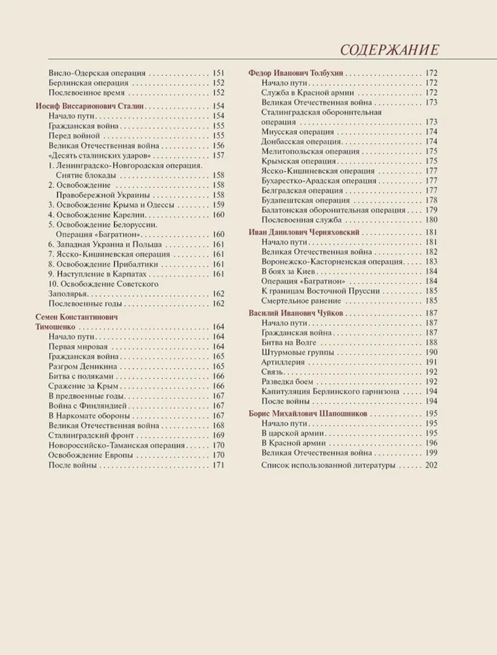Книга «Полководцы Победы» рассказывает о полководцах, командовавших Вооруженными Силами Советского Союза в период Великой Отечественной войны. Статьи включают биографии военачальников, описание их военных подвигов и наград, характеристику военных операций, которыми они руководили, оценку их роли в достижении Победы. Читатель узнает о жизненном пути и вкладе в Победу Г. К. Жукова, К. К. Рокоссовского, А. М. Василевского, К. Е. Ворошилова, С. М. Буденного, И. С. Конева и многих других.| Издательство | Просвещение-Союз |