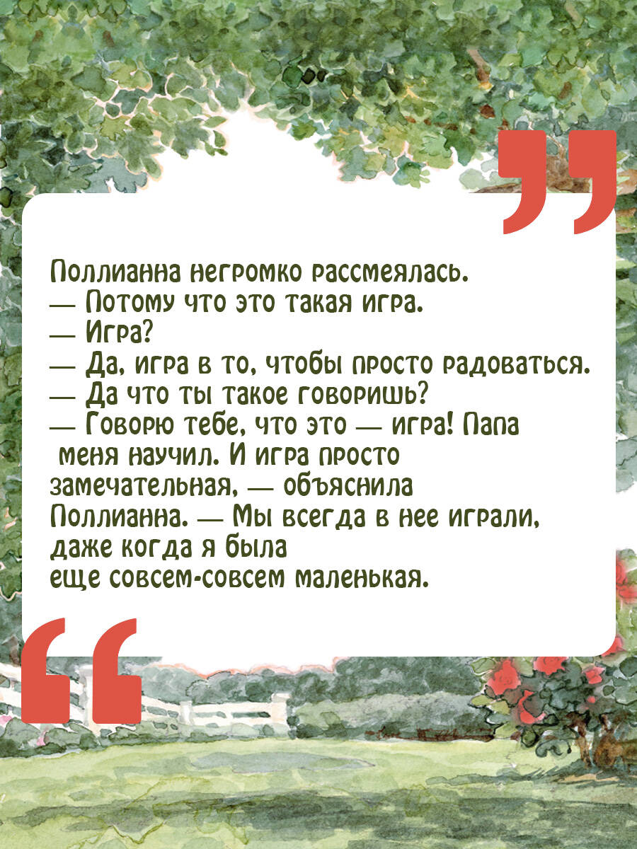 Маленькая Поллианна - сирота. Ее отправляют на попечение к своей тете Полли, и ровно с того момента размеренная жизнь небольшого городка сильно меняется. Девочка учит местных жителей игре «в радость» - умении находить что-то хорошее в самых простых и неочевидных вещах. Благодаря этой наивной выдумке даже самые своенравные люди стали замечать, что жизнь гораздо интереснее, чем они знали о ней. И какой скучной она была бы без Поллианны! Новые трогательные иллюстрации Натальи Демидовой перенесут читателя в маленький цветущий городок, где каждый житель учится игре юной героини.| Издательство | Издательство "АСТ" |