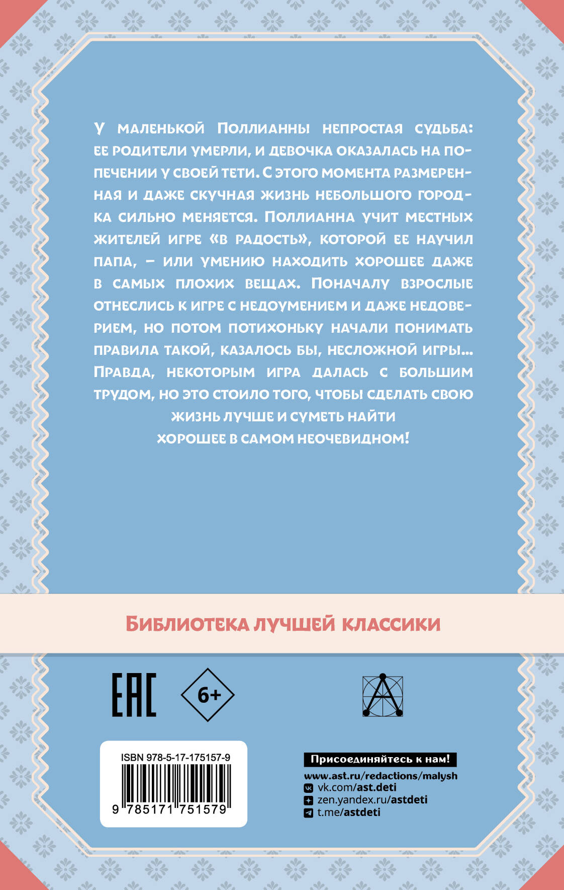 Роман американской писательницы Элинор Портер (1868-1920) о девочке Поллианне, придумавшей "игру в радость", впервые был опубликован в 1913 году. "Игра в радость" мгновенно захватила всю Америку, а затем и Европу. Поллианна - девочка одиннадцати лет. Ее мама рано умерла, и воспитывали девочку отец-священник и дамы из благотворительного комитета. У нее никогда не было своих красивых вещей, да и еда часто была скудной и невкусной. Однако во всех невзгодах и неприятностях она научилась находить радость и с удовольствием делиться этим с окружающими. Иллюстрации Н. Демидовой. Для среднего школьного возраста.| Издательство | Издательство "АСТ" |