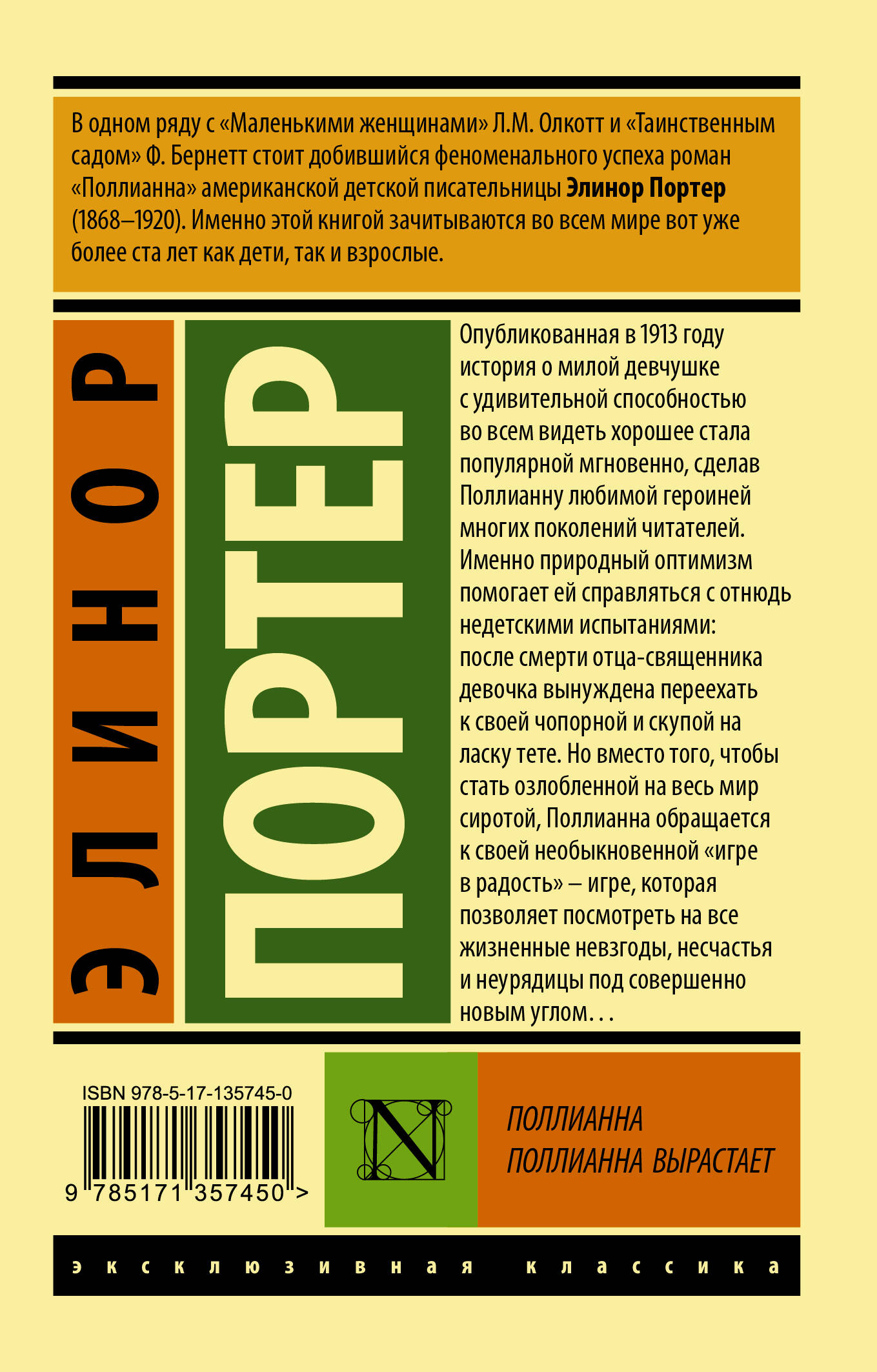 Опубликованная в 1913 году история о милой девчушке с удивительной способностью во всем видеть хорошее стала популярной мгновенно, сделав Поллианну любимой героиней многих поколений читателей. Именно природный оптимизм помогает ей справляться с отнюдь недетскими испытаниями: после смерти отца-священника девочка вынуждена переехать к своей чопорной и скупой на ласку тете. Но вместо того, чтобы стать озлобленной на весь мир сиротой, Поллианна обращается к своей необыкновенной "игре в радость" - игре, которая позволяет посмотреть на все жизненные невзгоды, несчастья и неурядицы под совершенно новым углом…| Издательство | ИЗДАТЕЛЬСТВО "АСТ" |