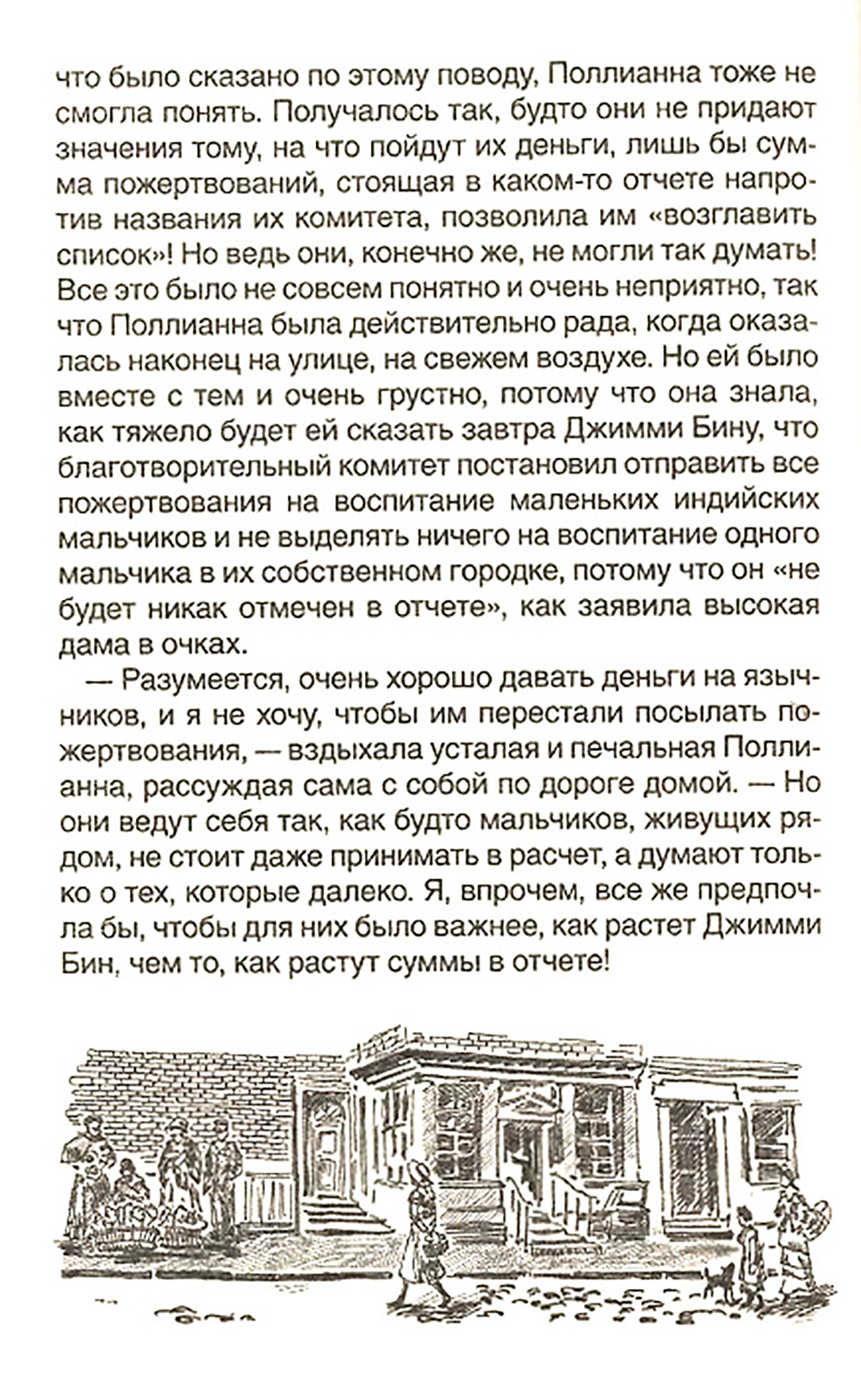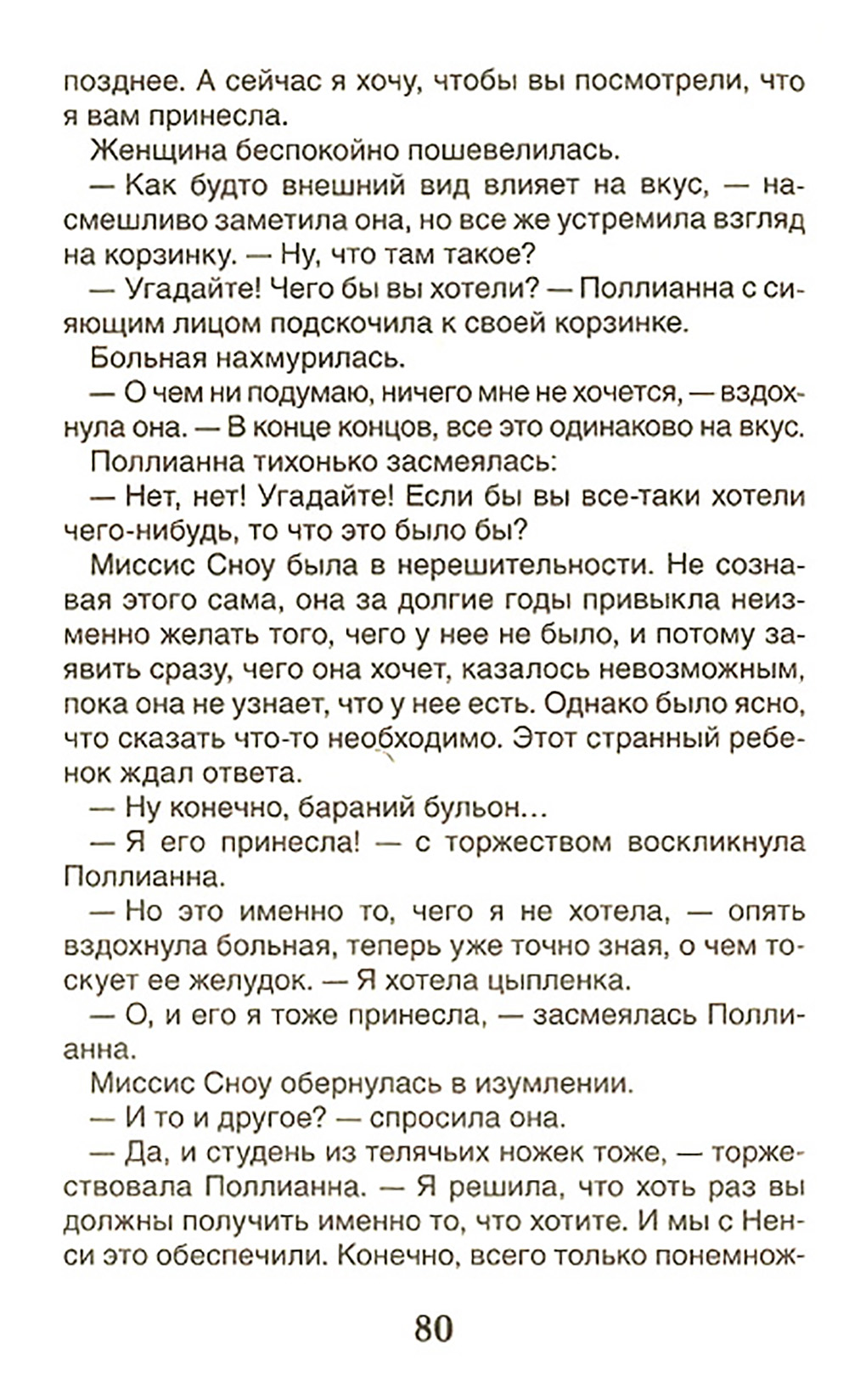 Роман американской писательницы Элинор Портер, написанный в 1913 году, мгновенно обрел широкую известность и до сих пор очень популярен. Читателей с первых страниц захватывает и увлекает судьба бедной сироты Поллианны, которая переезжает жить в дом своей суровой тети Полли. Что бы с ней ни происходило, девочка во всем пытается найти что-то хорошее и радостное. Ее живость и непосредственность удивляют и смешат жителей городка, а доброта, доверчивость и готовность прийти на помощь способны растопить любое сердце - и старого холостяка, и сварливой, вечно всем недовольной больной миссис Cноу, и замкнувшейся в холодном одиночестве тети Полли. Когда с Поллианной случается несчастье, весь город спешит ее поддержать, вернуть ей радость жизни. Забота окружающих и страстное желание самой девочки всех радовать совершают чудо и поднимают ее на ноги.| Издательство | РОСМЭН |