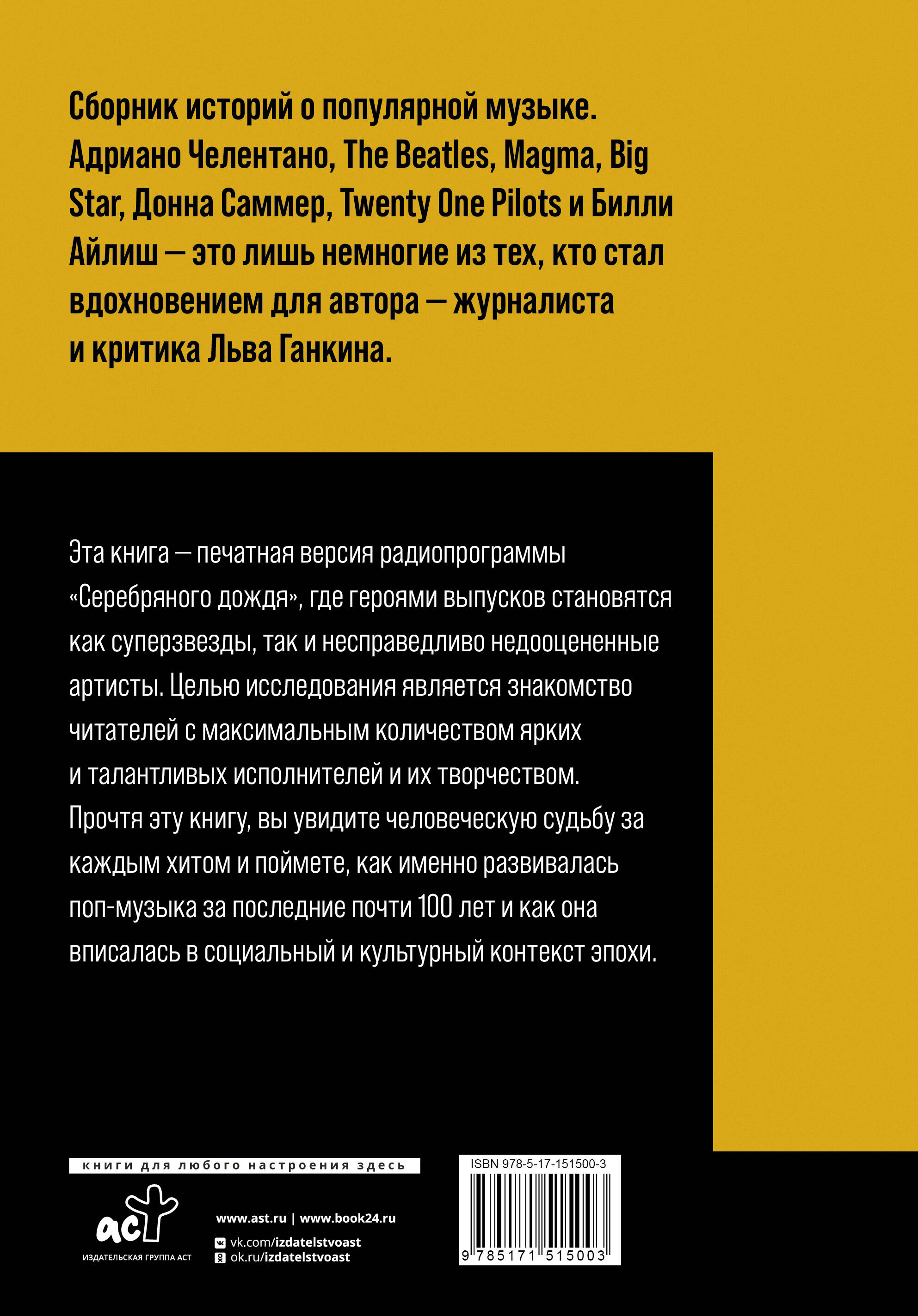 Сборник историй о популярной музыке. Адриано Челентано, The Beatles, Magma, Big Star, Донна Саммер, Twenty One Pilots и Билли Айлиш - это лишь немногие из тех, кто стал вдохновением для автора - журналиста и критика Льва Ганкина. Эта книга - печатная версия радиопрограммы "Серебряного дождя", где героями выпусков становятся как суперзвезды, так и несправедливо недооцененные артисты. Целью исследования является знакомство читателей с максимальным количеством ярких и талантливых исполнителей и их творчеством. Прочтя эту книгу, вы увидите человеческую судьбу за каждым хитом и поймете, как именно развивалась поп-музыка за последние почти 100 лет и как она вписалась в социальный и культурный контекст эпохи.| Издательство | ИЗДАТЕЛЬСТВО "АСТ" |