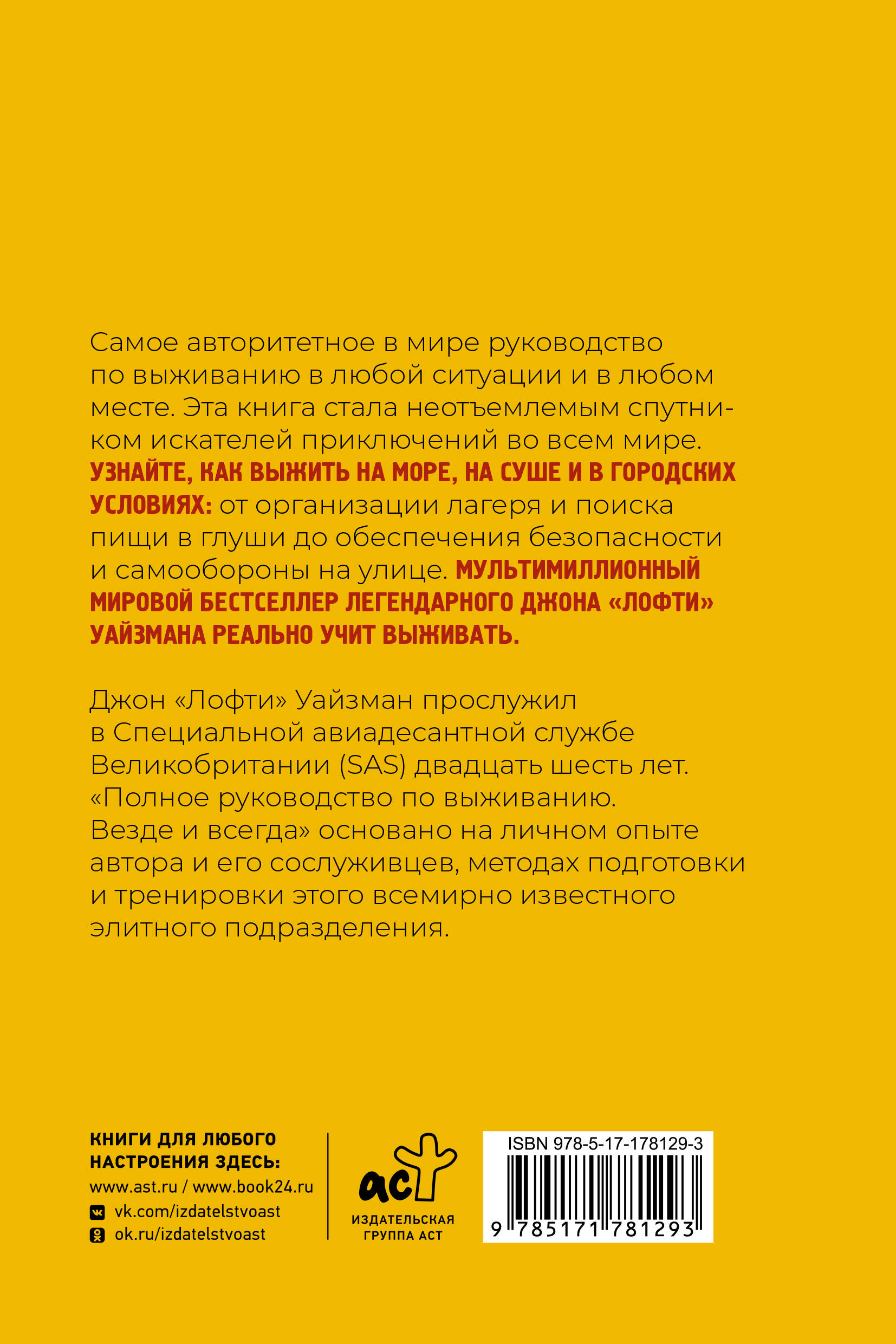 Самое авторитетное в мире руководство по выживанию в любой ситуации и в любом месте. Эта книга стала неотъемлемым спутником искателей приключений во всем мире. Узнайте, как выжить на море, на суше и в городских условиях: от организации лагеря и поиска пищи в глуши до обеспечения безопасности и самообороны на улице. Мульмимиллионный мировой бестселлер легендарного Джона "Лофти" Уайзмана реально учит выживать. Джон "Лофти" Уайзман прослужил в Специальной авиадесантной службе Великобритании (SAS) двадцать шесть лет. "Полное руководство по выживанию. Везде и всегда" основано на личном опыте автора и его сослуживцев, а также методах подготовки и тренировки этого всемирно известного элитного подразделения.| Издательство | Издательство "АСТ" |
