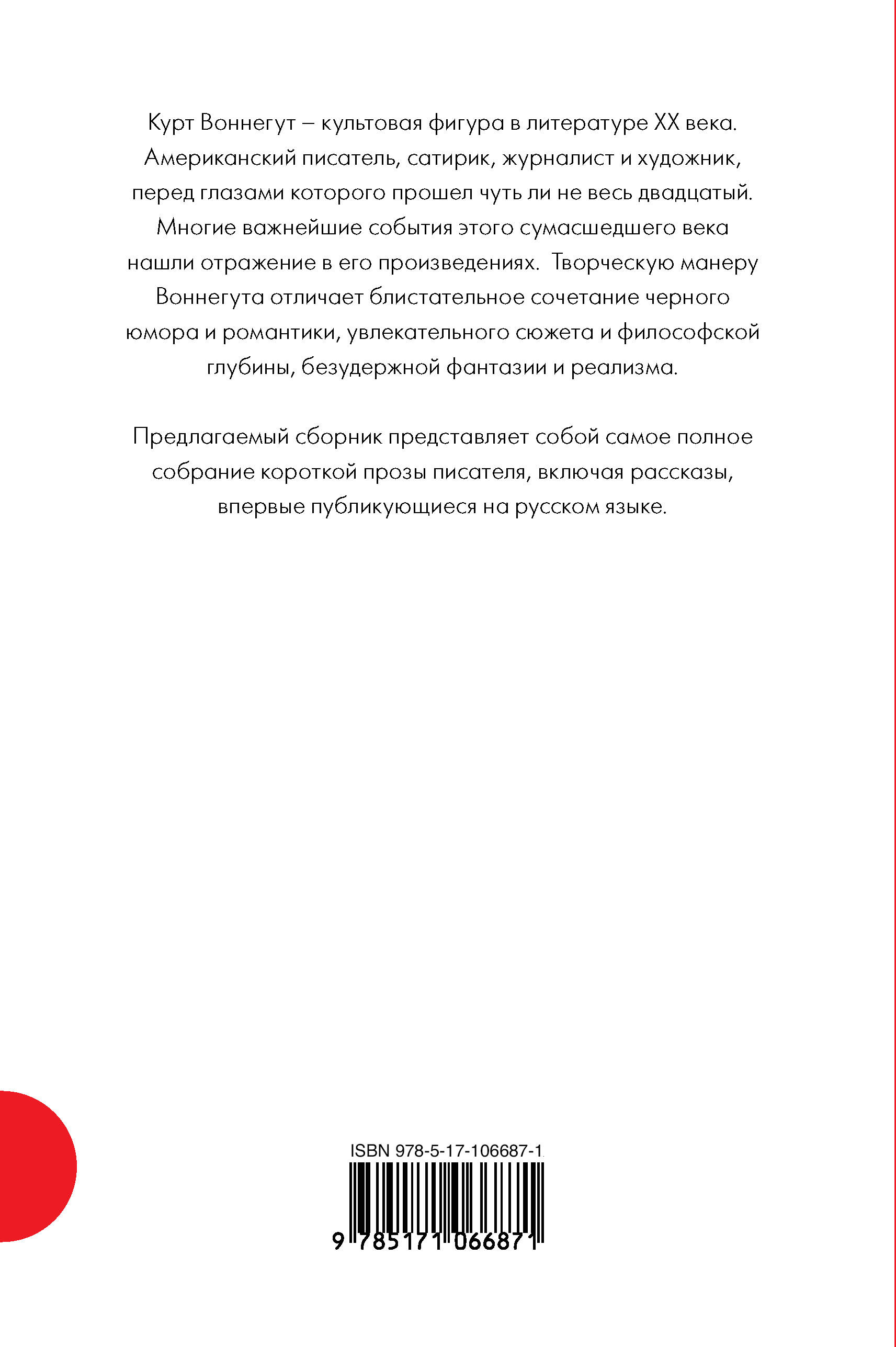 Курт Воннегут - культовая фигура в литературе ХХ века. Американский писатель, сатирик, журналист и художник, перед глазами которого "прошел" чуть ли не весь двадцатый. Многие важнейшие события этого сумасшедшего века нашли отражение в его произведениях. Творческую манеру Воннегута отличают блистательное сочетание черного юмора и романтики, увлекательного сюжета и философской глубины, безудержной фантазии и реализма. Предлагаемый сборник представляет собой самое полное собрание короткой прозы писателя, включая рассказы, впервые публикующиеся на русском языке.