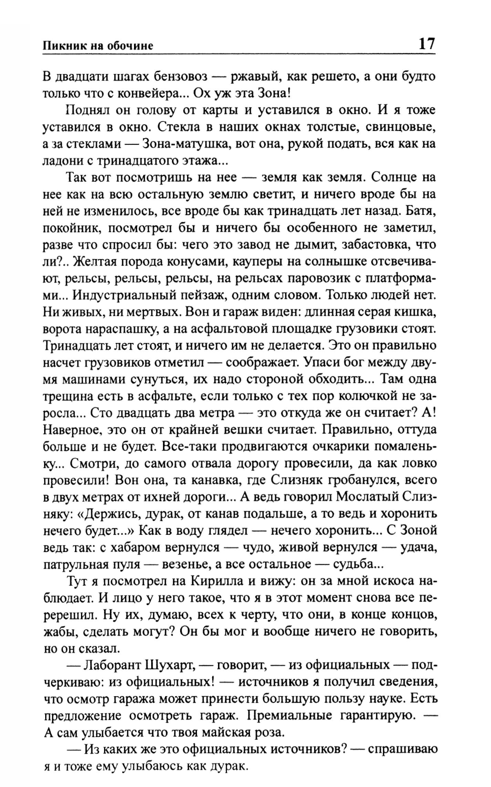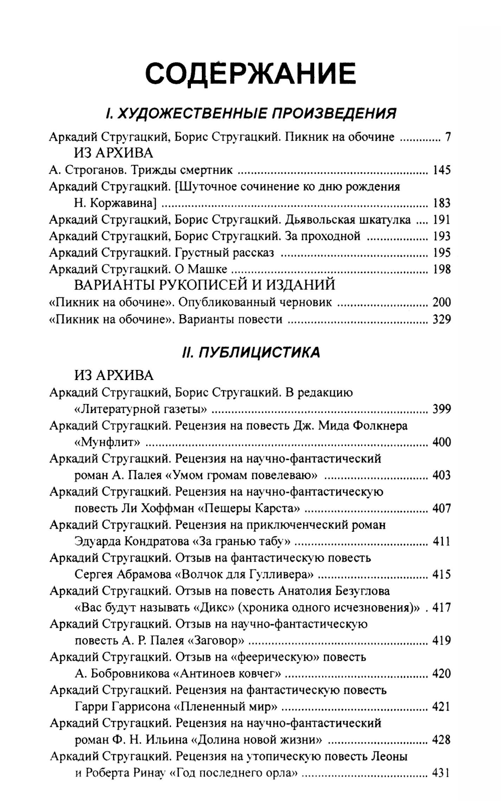 Семнадцатый том собрания сочинений Аркадия и Бориса Стругацких в 33 томах включает в себя повесть «Пикник на обочине», две киноминиатюры Стругацких и несколько произведений Аркадия Стругацкого, рассмотрены варианты повести «Пикник на обочине», в разделе публицистики печатаются статьи Стругацких. Том завершается справочным разделом, включающим комментарии, примечания, библиографию, указатели. Том снабжен подборкой фотографий Стругацких и их рисунков.| Издательство | Изд. Сидорович |