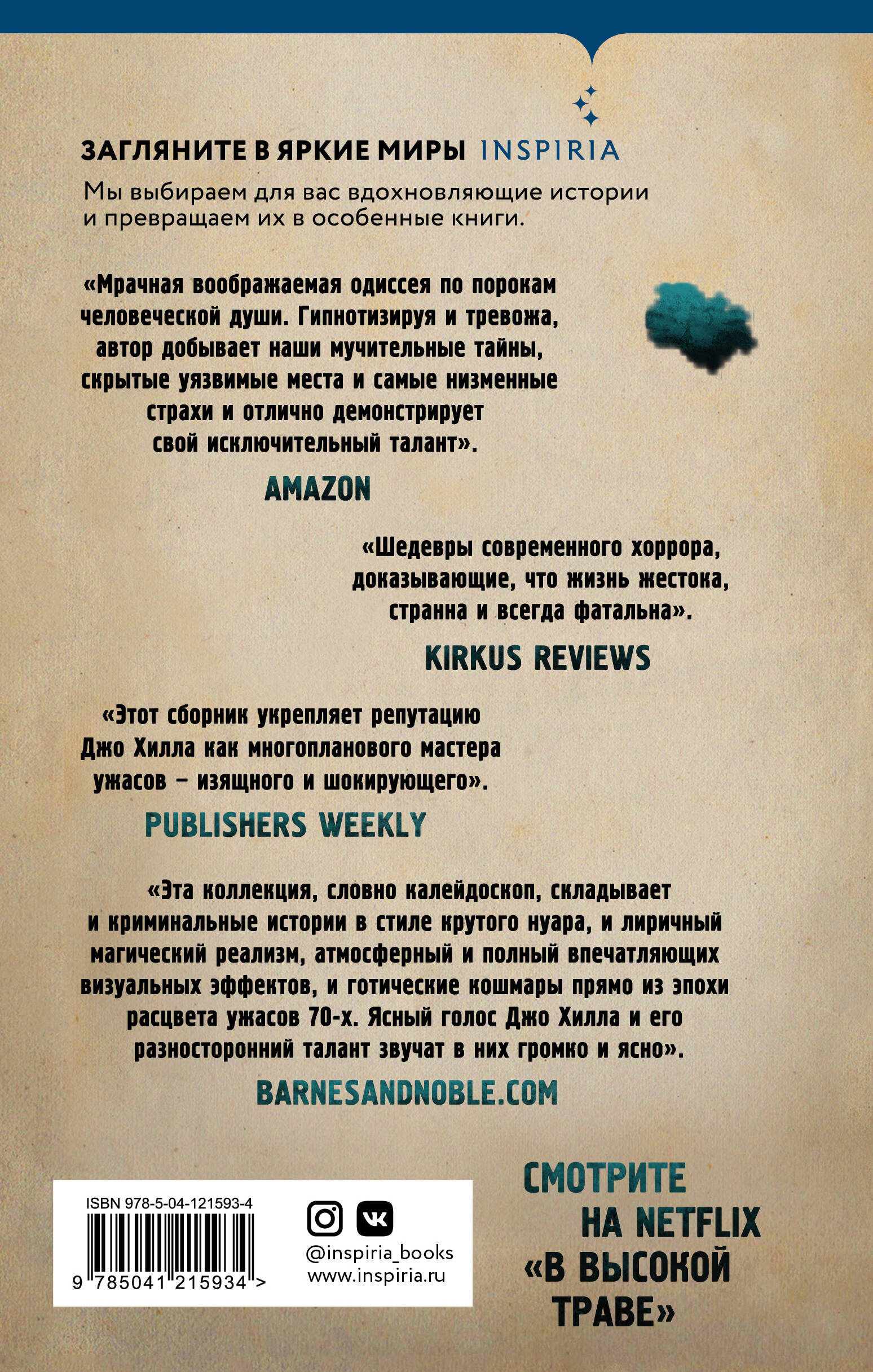 Премия Audie Awards 2020. Шортлист премий «Локус» и «Гудридс». Автор бестселлеров New York Times «Пожарный», «NOS4A2. Носферату», «Ключи Локков» и «Странная погода» возвращается с новой мрачной коллекцией из завораживающих повестей и захватывающих рассказов, включая два рассказа, написанных совместно со Стивеном Кингом, и две истории, по которым уже сняли художественные фильмы. В них Джо Хилл мастерски препарирует человеческую жизнь и открывает для читателя дверь в фантастический мир. Мир, в котором в озере можно найти плезиозавра, где мертвые ждут книжные новинки, где банды байкеров танцуют зловещие танцы, а в высокой траве вас подстерегает смерть. Гипнотизирующая и тревожащая одиссея по скрытым уязвимым местам и мучительным тайнам человеческой психики. «Сборник укрепляет репутацию Джо Хилла как многопланового мастера ужасов - изящного и шокирующего». - PUBLISHERS WEEKLY «Эта коллекция, словно калейдоскоп, складывает и криминальные истории в стиле крутого нуара, и лиричный магический реализм, атмосферный и полный впечатляющих визуальных эффектов, и готические кошмары прямо из эпохи расцвета ужасов 70-х. Ясный голос Джо Хилла и его разносторонний талант звучат в них громко и ясно». - BARNESANDNOBLE.COM «Мрачная воображаемая одиссея по порокам человеческой души. Гипнотизируя и тревожа, автор добывает наши мучительные тайны, скрытые уязвимые места и самые низменные страхи, и отлично демонстрирует свой исключительный талант». - AMAZON «Шедевры современного хоррора, доказывающие, что жизнь жестока, странна и всегда фатальна». - KIRKUS REVIEWS| Издательство | ООО "Издательство "Эксмо" |