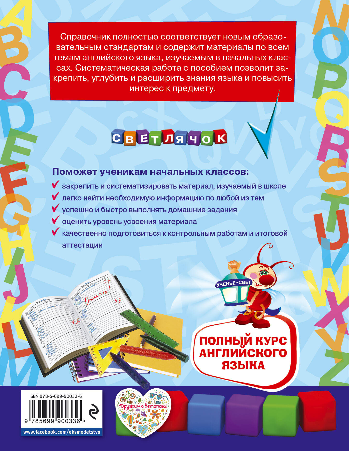 Основная цель книги - последовательное освоение всех тем школьной программы начальной школы по английскому языку. Справочник отличается максимальной наглядностью: к каждой теме приведены задания, выполнив которые, ученик сможет на практике убедиться в том, что материал усвоен. В книге имеются англо-русский словарь, а также тестовые задания, позволяющие оценить и проконтролировать знания учащегося. Справочник обеспечит глубокое освоение школьной программы, поможет систематизировать знания, восстановить возможные пробелы в них и подготовиться к итоговому тестированию. Приобретая справочник для своего ребенка, вы поможете ему: • закрепить знания; • более глубоко усвоить учебный материал; • усовершенствовать полученные навыки и умения; • оценить уровень усвоения материала с помощью тестов; • освоить тестовую форму контроля и подготовиться к итоговой аттестации.| Издательство | ООО "Издательство "Эксмо" |