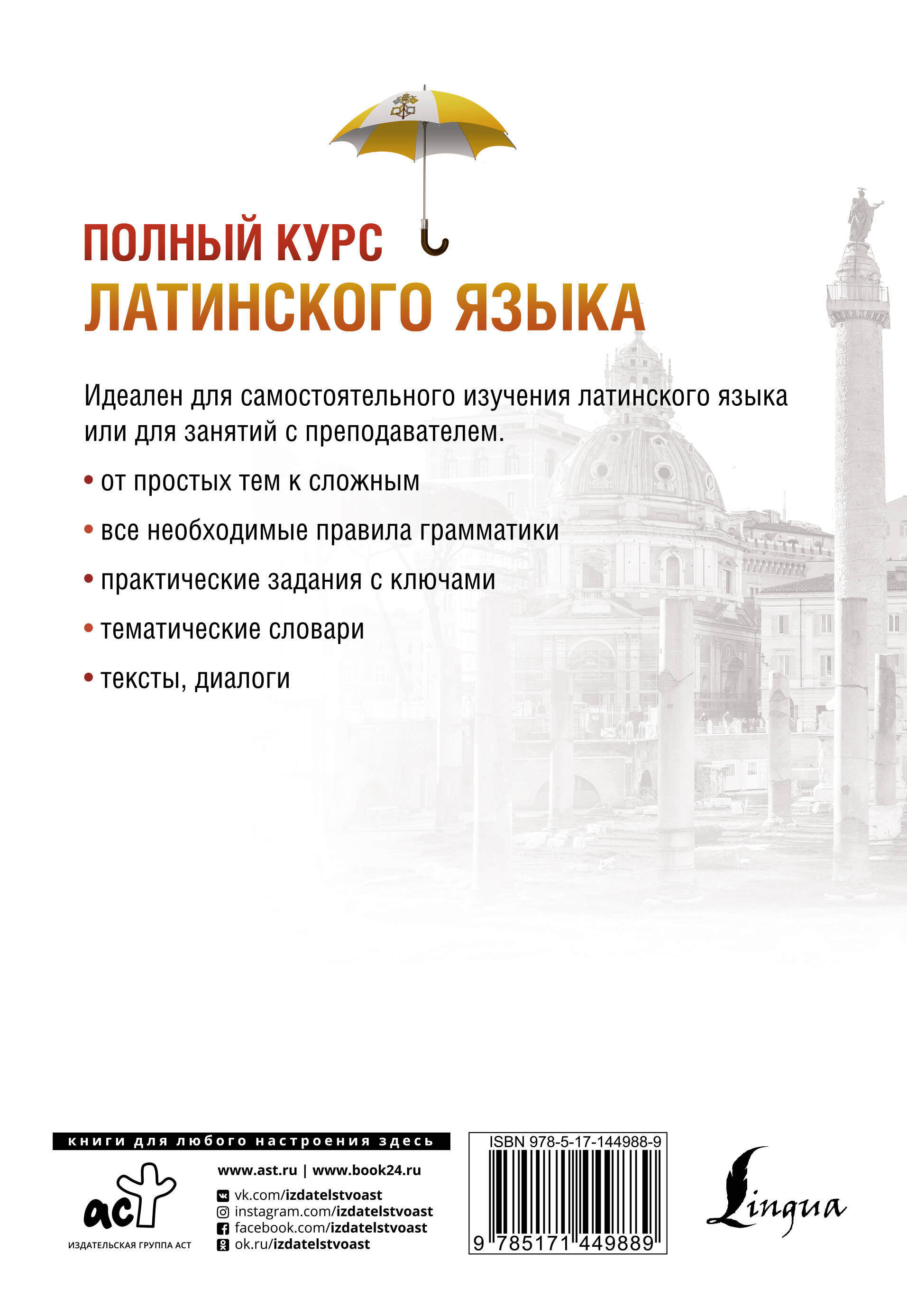 Пособие «Полный курс латинского языка» подходит для самостоятельного изучения латыни, а также будет полезно в качестве вспомогательного пособия на занятиях с преподавателем. В книге содержатся: • Основные правила грамматики • Особенности частей речи • Склонение именных частей речи • Время глагола • Практические упражнения с ключами • Тематические словари • Тексты и диалоги| Издательство | АСТ |