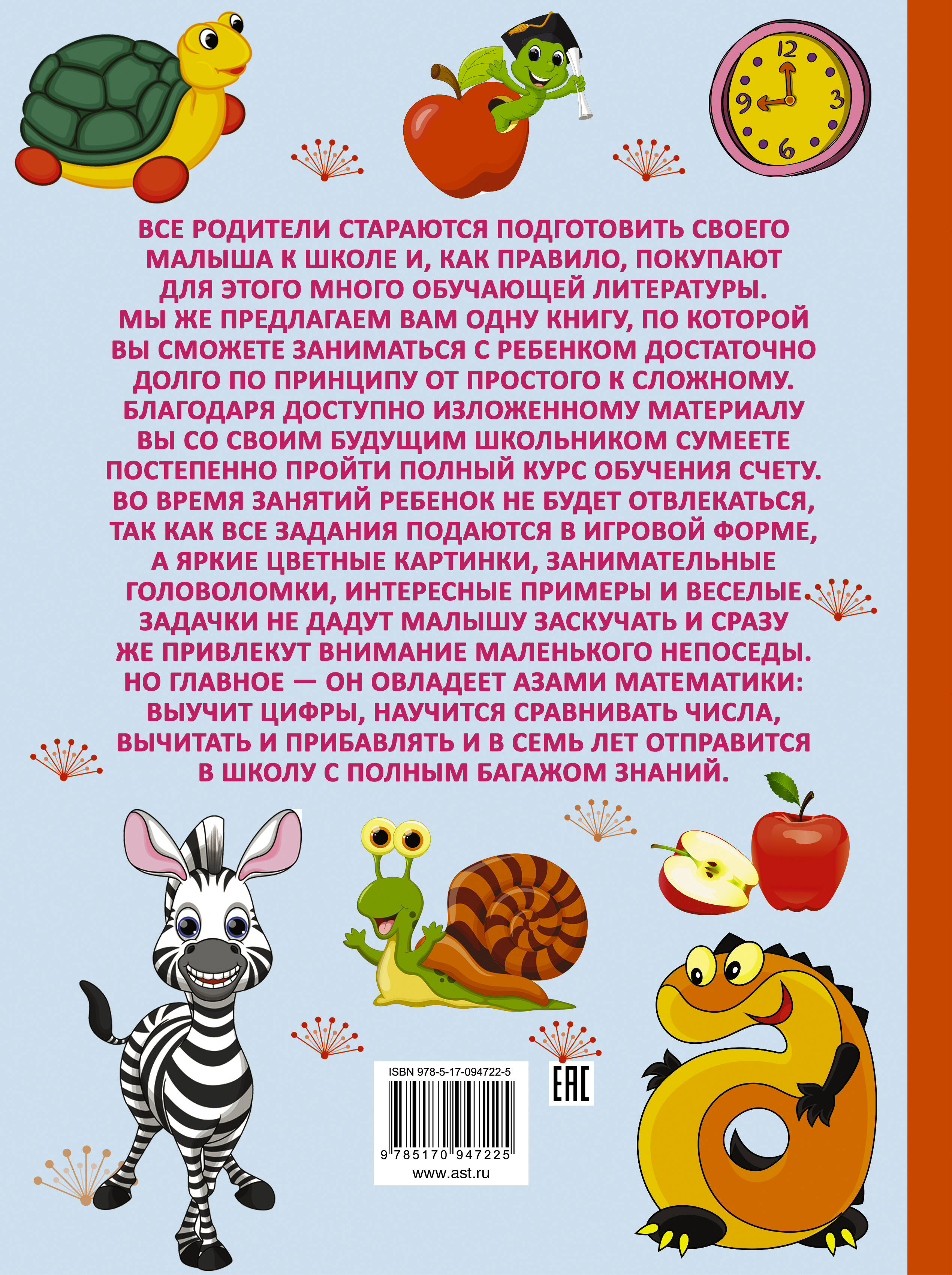 Полный курс обучения счёту - это уникальная книга, которая может стать первым учебником для вашего малыша! Благодаря заданиям, поданным в игровой форме, занимательным головоломкам и весёлым задачкам, которые сопровождаются яркими иллюстрациями, ваш малыш не только познакомится с цифрами, но и научится уверенно считать.| Издательство | ИЗДАТЕЛЬСТВО "АСТ" |