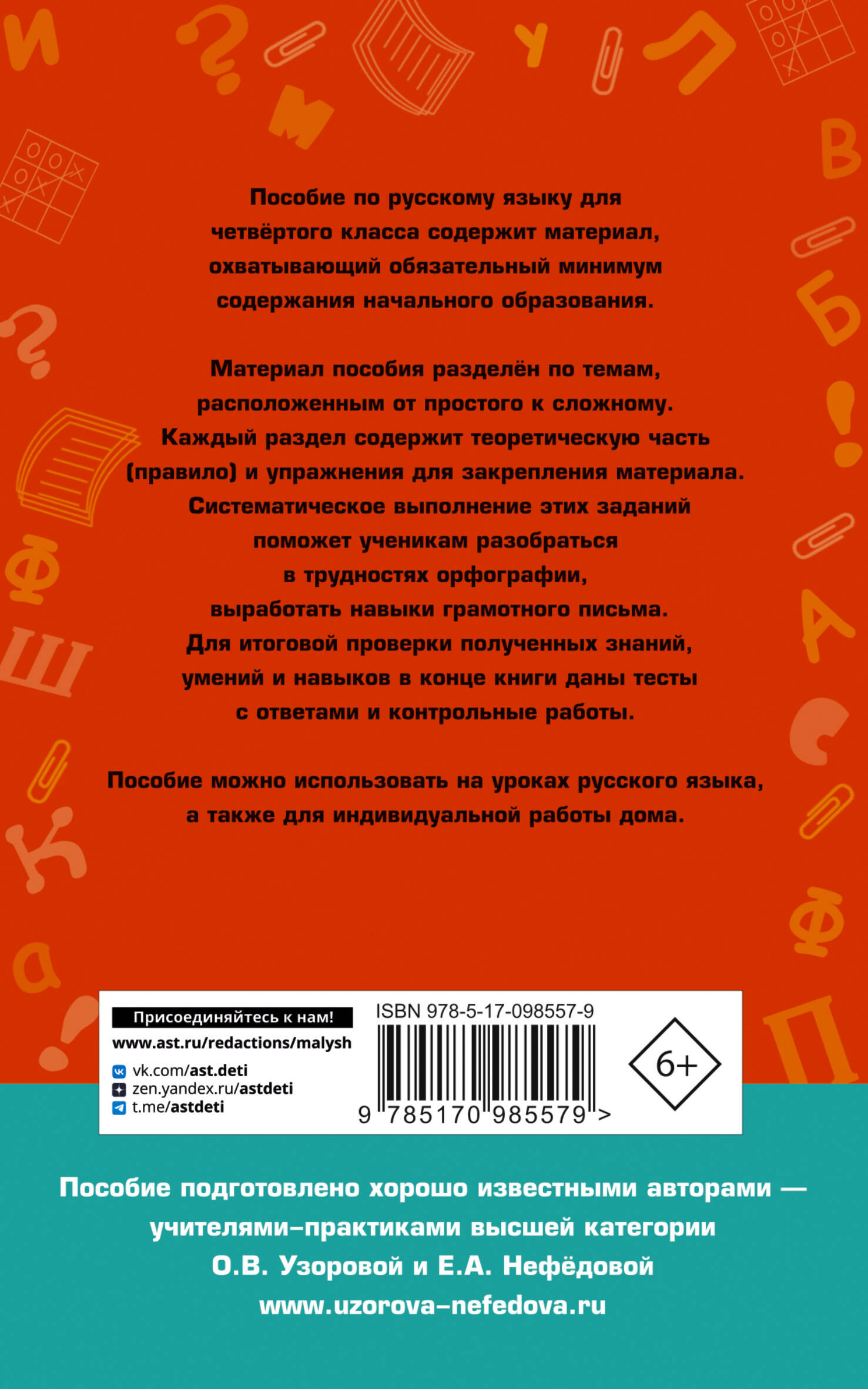 Полный курс русского языка для второго класса содержит все необходимые правила, которые второклассник обязательно должен знать, чтобы потом использовать выученную теорию на практике. С помощью разнообразных упражнений, а также контрольных и тестовых заданий ученики лучше осваивают изучаемую тему, тренируют память, повышают орфографическую грамотность и культуру письменной речи. Книгу можно использовать на уроках русского языка, а также для индивидуальной работы дома.| Издательство | АСТ |