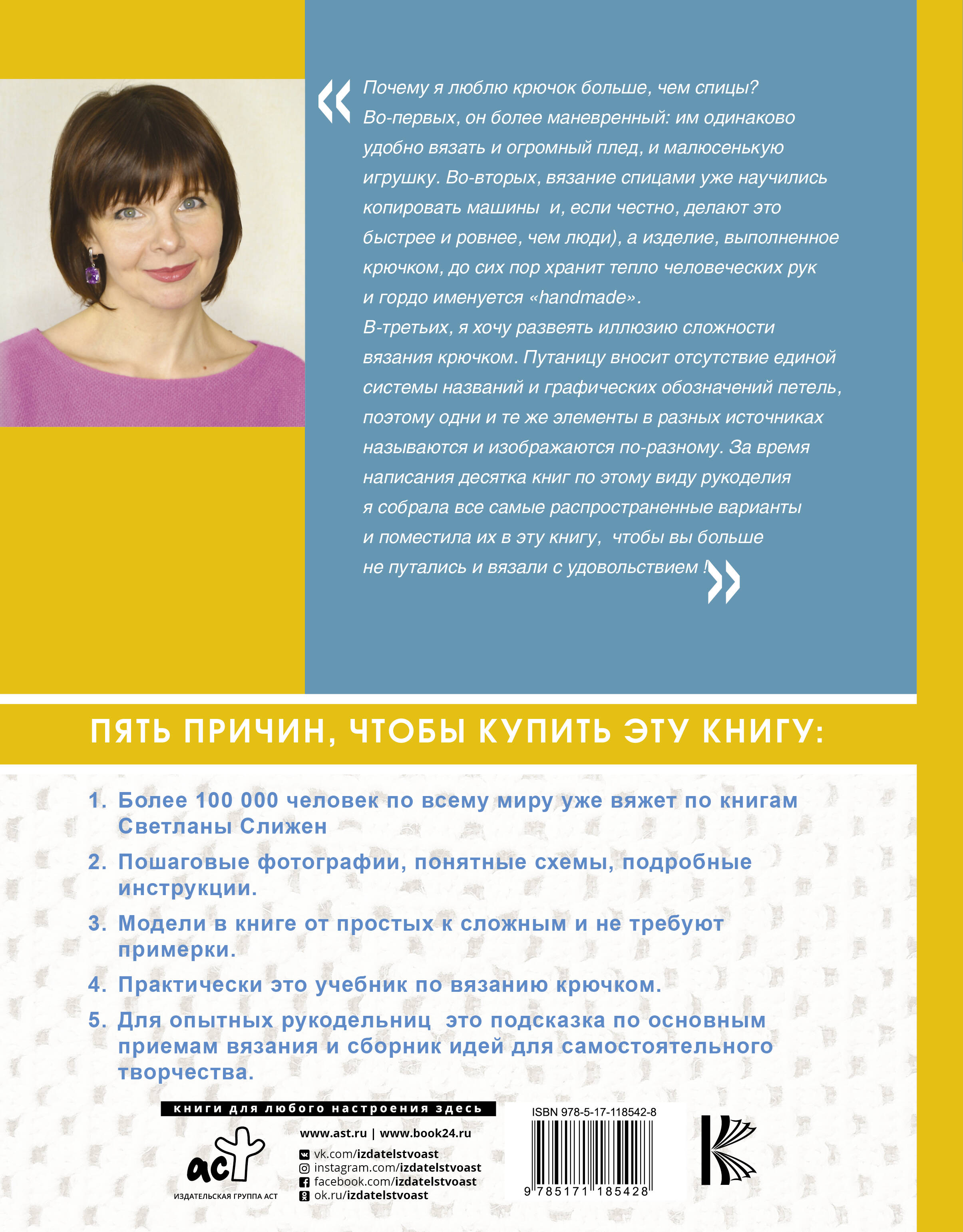Вязание крючком - это очень простой вид рукоделия, который под силу каждому. Достаточно научиться выполнять всего несколько элементов и понимать принципы по которым они разными способами соединяются в полотно, чтобы связать практически любое изделие. В этой книге в одном месте собраны самые распространенные элементы вязания крючком, перечислены все варианты их названий и обозначений, чтобы вы могли легко разобраться со схемами и описаниями из любых источников. Принципы вязания продемонстрированы наглядно на примере более трех десятков моделей, а пошаговые фотографии и авторские схемы помогут справиться с работой даже новичкам.| Издательство | Издательство "АСТ" |