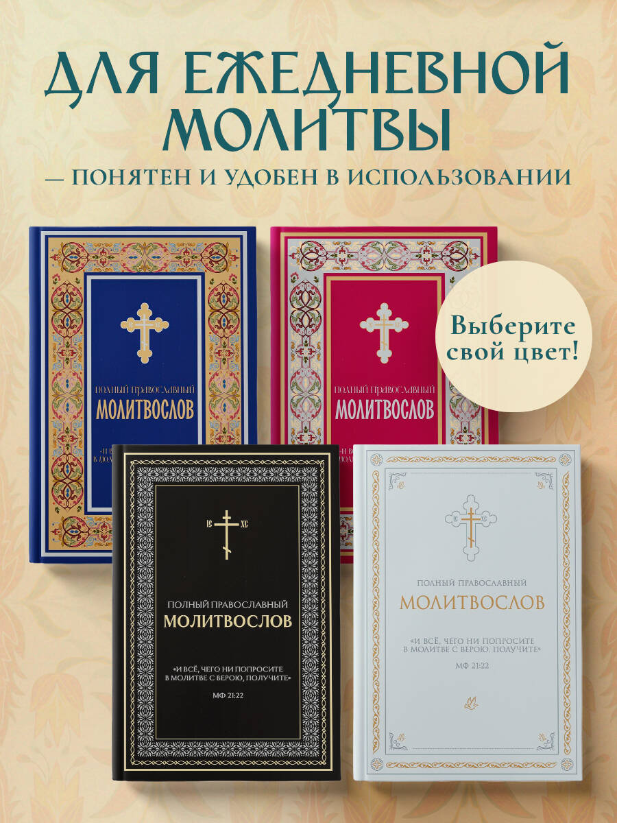 Полный православный молитвослов - настольная книга каждого верующего, сопровождающая его в буднях и праздниках, в радости и скорби. В нём собраны все основные молитвы на каждый день: утреннее и вечернее правило, покаянный канон ко Господу Иисусу Христу, канон Ангелу-Хранителю, последование ко Святому Причащению и благодарственные молитвы после Причастия. Раздел «Молитвы на всякую потребу» включает прошения о здравии и в болезни, о семье и детях, о путешествующих, о доме, о мире и Отечестве, в скорбях и искушениях, а также молитвы перед выходом из дома, перед сном, на Новый год и день рождения. В молитвослов входят акафисты Господу Иисусу Христу, Пресвятой Богородице (в честь икон Всецарица, Неупиваемая Чаша, Всех скорбящих Радость), святителю Николаю Чудотворцу, праведному Иоанну Кронштадтскому, блаженной Матроне Московской, царственным страстотерпцам, а также благодарственный акафист «Слава Богу за всё». Тексты приведены по богослужебным изданиям Русской Православной Церкви в современной орфографии, что делает чтение доступным и удобным. Молитвослов адресован мирянам, воцерковлённым христианам, начинающим верующим и пожилым людям - всем, кто стремится к живой молитве и духовной поддержке. Благодаря современному и стильному оформлению, качественной печати и удобному формату издание станет душевным и достойным православным подарком для родных, друзей, крестников и коллег на Рождество, Пасху, именины, венчание или любой духовный праздник. Молитвослов полный, православный, с акафистами - на каждый день и на все случаи жизни.| Издательство | ООО "Издательство "Эксмо" |
