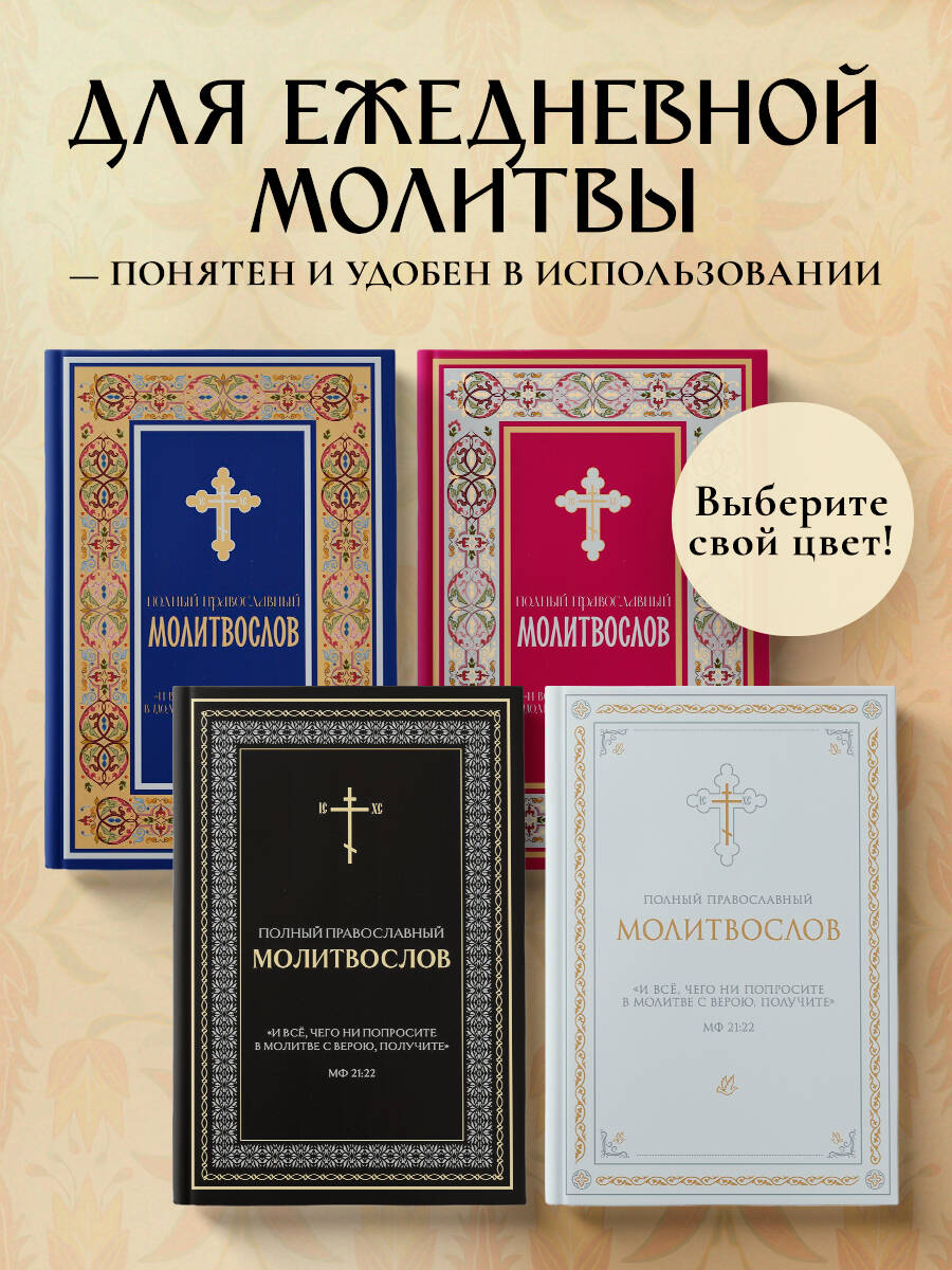 Полный православный молитвослов - настольная книга каждого верующего, сопровождающая его в буднях и праздниках, в радости и скорби. В нём собраны все основные молитвы на каждый день: утреннее и вечернее правило, покаянный канон ко Господу Иисусу Христу, канон Ангелу-Хранителю, последование ко Святому Причащению и благодарственные молитвы после Причастия. Раздел «Молитвы на всякую потребу» включает прошения о здравии и в болезни, о семье и детях, о путешествующих, о доме, о мире и Отечестве, в скорбях и искушениях, а также молитвы перед выходом из дома, перед сном, на Новый год и день рождения. В молитвослов входят акафисты Господу Иисусу Христу, Пресвятой Богородице (в честь икон Всецарица, Неупиваемая Чаша, Всех скорбящих Радость), святителю Николаю Чудотворцу, праведному Иоанну Кронштадтскому, блаженной Матроне Московской, царственным страстотерпцам, а также благодарственный акафист «Слава Богу за всё». Тексты приведены по богослужебным изданиям Русской Православной Церкви в современной орфографии, что делает чтение доступным и удобным. Молитвослов адресован мирянам, воцерковлённым христианам, начинающим верующим и пожилым людям - всем, кто стремится к живой молитве и духовной поддержке. Благодаря современному и стильному оформлению, качественной печати и удобному формату, издание станет душевным и достойным православным подарком для родных, друзей, крестников и коллег на Рождество, Пасху, именины, венчание или любой духовный праздник. Молитвослов полный, православный, с акафистами - на каждый день и на все случаи жизни.| Издательство | ООО "Издательство "Эксмо" |