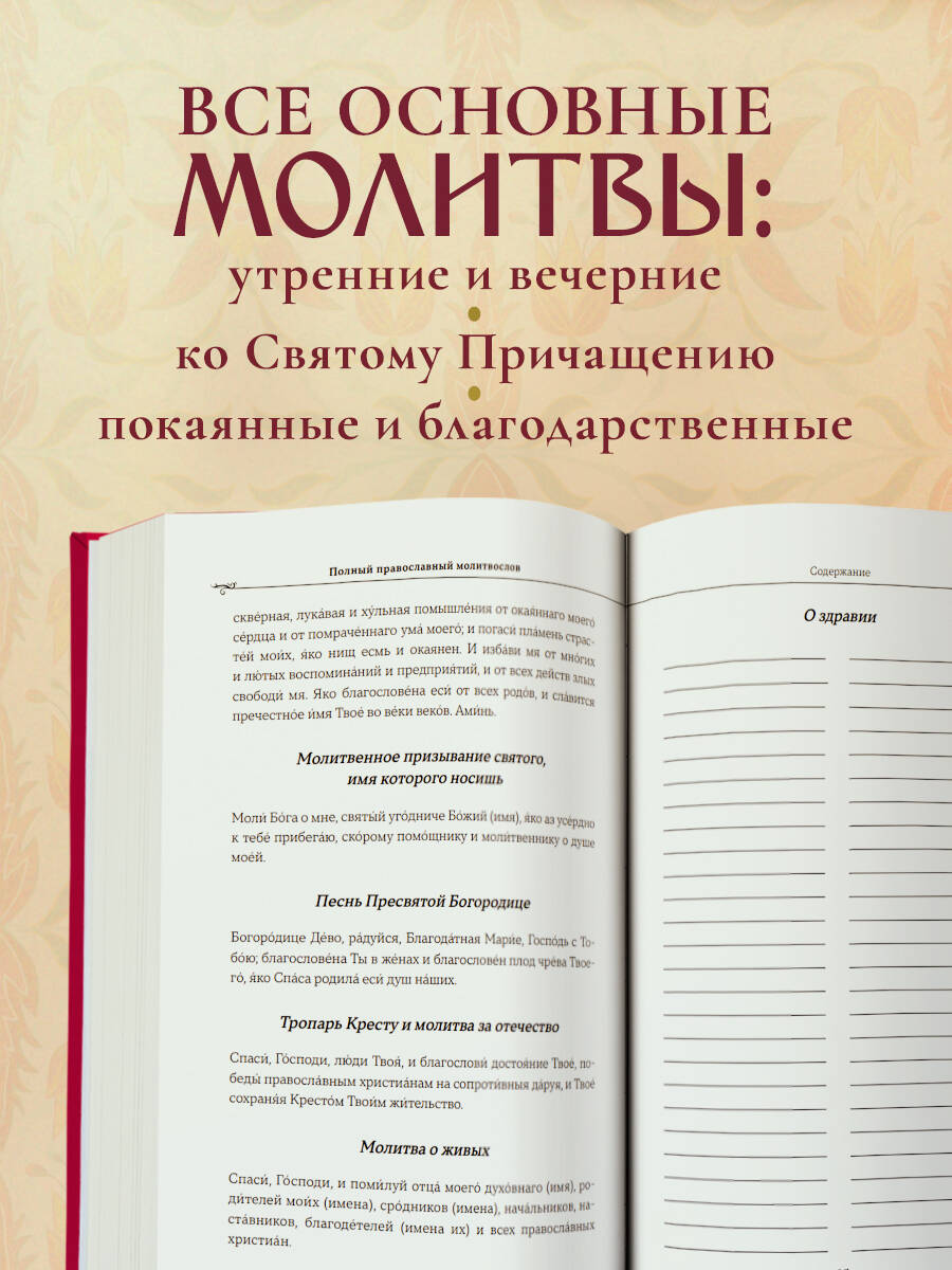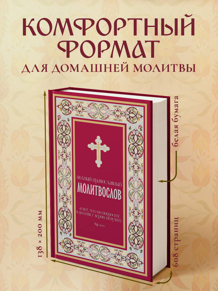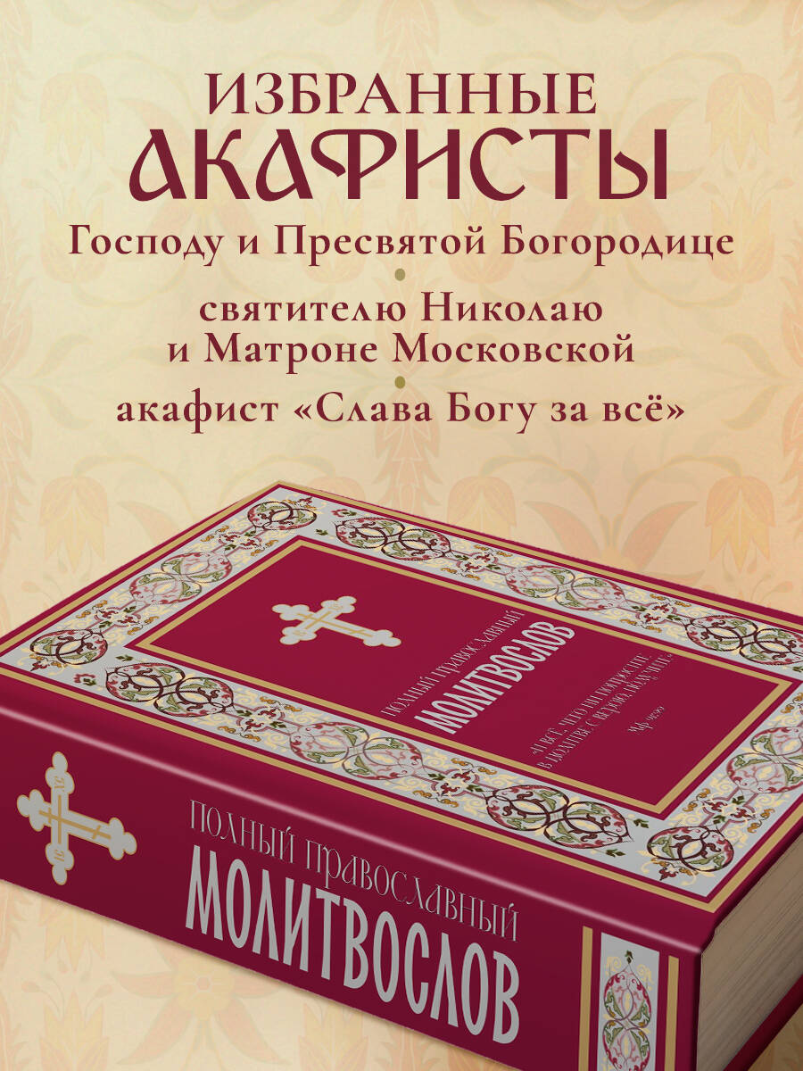 Полный православный молитвослов - настольная книга каждого верующего, сопровождающая его в буднях и праздниках, в радости и скорби. В нём собраны все основные молитвы на каждый день: утреннее и вечернее правило, покаянный канон ко Господу Иисусу Христу, канон Ангелу-Хранителю, последование ко Святому Причащению и благодарственные молитвы после Причастия. Раздел «Молитвы на всякую потребу» включает прошения о здравии и в болезни, о семье и детях, о путешествующих, о доме, о мире и Отечестве, в скорбях и искушениях, а также молитвы перед выходом из дома, перед сном, на Новый год и день рождения. В молитвослов входят акафисты Господу Иисусу Христу, Пресвятой Богородице (в честь икон Всецарица, Неупиваемая Чаша, Всех скорбящих Радость), святителю Николаю Чудотворцу, праведному Иоанну Кронштадтскому, блаженной Матроне Московской, царственным страстотерпцам, а также благодарственный акафист «Слава Богу за всё». Тексты приведены по богослужебным изданиям Русской Православной Церкви в современной орфографии, что делает чтение доступным и удобным. Молитвослов адресован мирянам, воцерковлённым христианам, начинающим верующим и пожилым людям - всем, кто стремится к живой молитве и духовной поддержке. Благодаря современному и стильному оформлению, качественной печати и удобному формату издание станет душевным и достойным православным подарком для родных, друзей, крестников и коллег на Рождество, Пасху, именины, венчание или любой духовный праздник. Молитвослов полный, православный, с акафистами - на каждый день и на все случаи жизни.| Издательство | ООО "Издательство "Эксмо" |