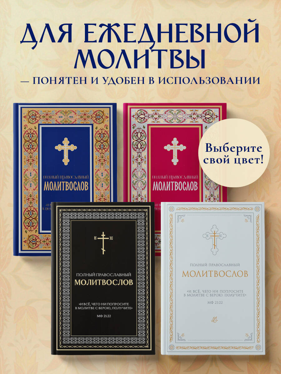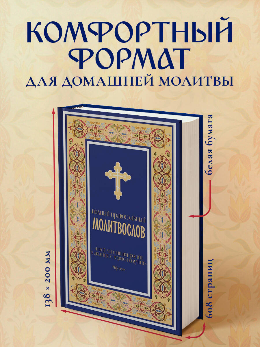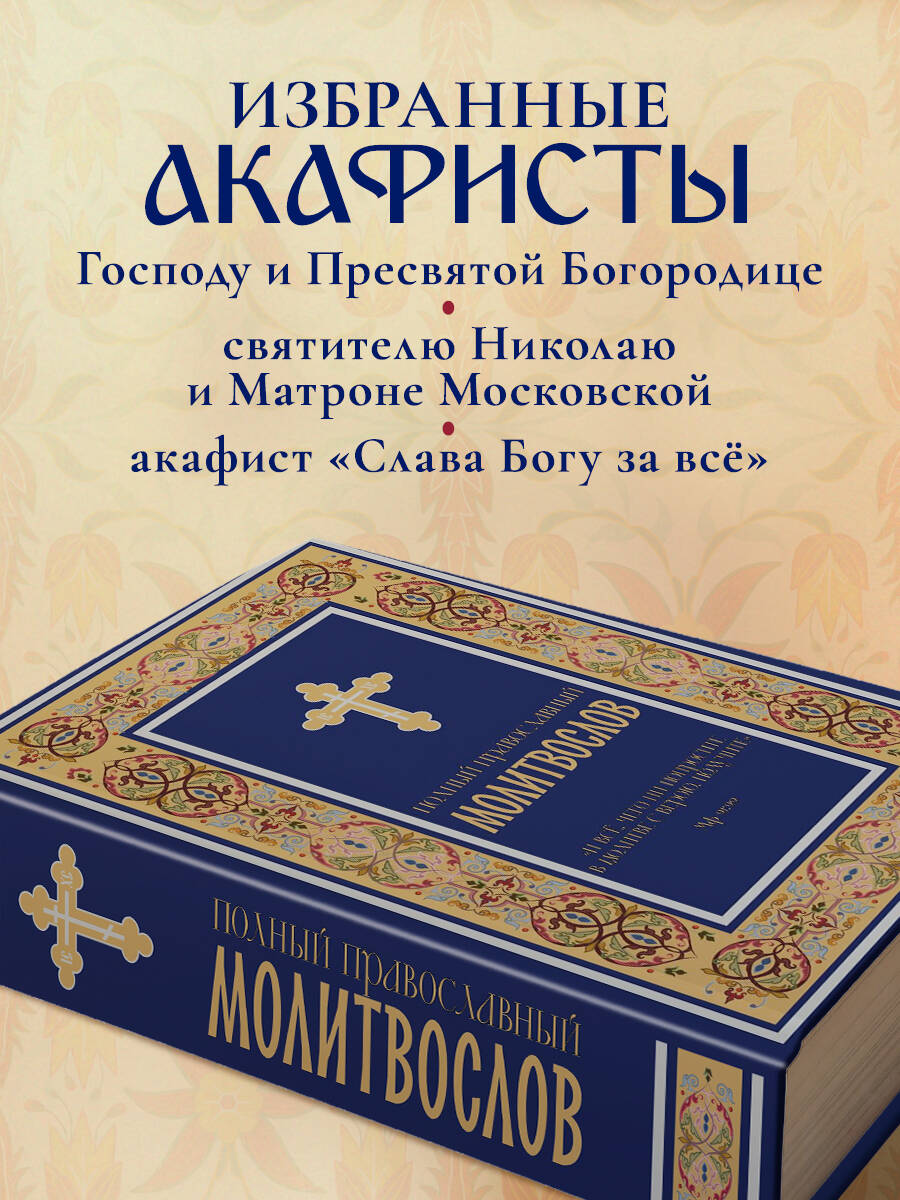 Полный православный молитвослов - настольная книга каждого верующего, сопровождающая его в буднях и праздниках, в радости и скорби. В нём собраны все основные молитвы на каждый день: утреннее и вечернее правило, покаянный канон ко Господу Иисусу Христу, канон Ангелу-Хранителю, последование ко Святому Причащению и благодарственные молитвы после Причастия. Раздел «Молитвы на всякую потребу» включает прошения о здравии и в болезни, о семье и детях, о путешествующих, о доме, о мире и Отечестве, в скорбях и искушениях, а также молитвы перед выходом из дома, перед сном, на Новый год и день рождения. В молитвослов входят акафисты Господу Иисусу Христу, Пресвятой Богородице (в честь икон Всецарица, Неупиваемая Чаша, Всех скорбящих Радость), святителю Николаю Чудотворцу, праведному Иоанну Кронштадтскому, блаженной Матроне Московской, царственным страстотерпцам, а также благодарственный акафист «Слава Богу за всё». Тексты приведены по богослужебным изданиям Русской Православной Церкви в современной орфографии, что делает чтение доступным и удобным. Молитвослов адресован мирянам, воцерковлённым христианам, начинающим верующим и пожилым людям - всем, кто стремится к живой молитве и духовной поддержке. Благодаря современному и стильному оформлению, качественной печати и удобному формату издание станет душевным и достойным православным подарком для родных, друзей, крестников и коллег на Рождество, Пасху, именины, венчание или любой духовный праздник. Молитвослов полный, православный, с акафистами - на каждый день и на все случаи жизни.| Издательство | ООО "Издательство "Эксмо" |
