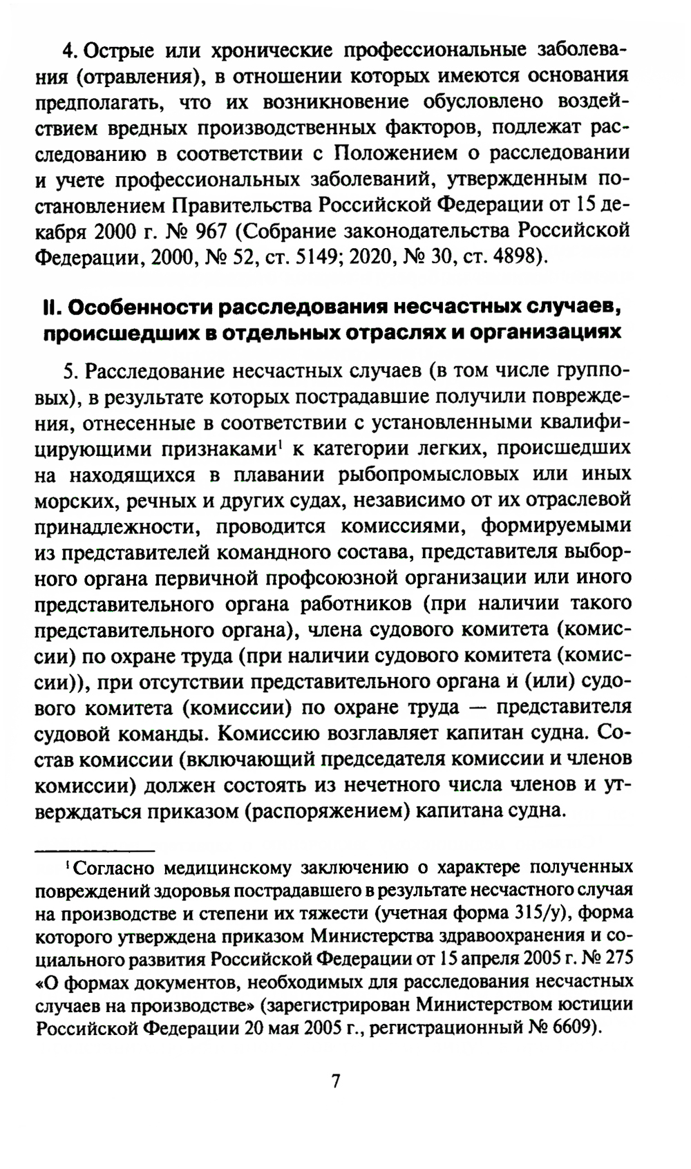 Положение об особенностях расследования несчастных случаев на производстве в отдельных отраслях и организациях устанавливает с учетом требований, определенных Трудовым кодексом Российской Федерации, особенности расследования несчастных случаев на производстве в отдельных отраслях и организациях, происшедших у работодателей (представителей нанимателей) с различными категориями работников (граждан), выполняющих работу, имеющую специфический характер труда, в том числе происшедших на находящихся в плавании рыбопромысловых и иных морских, речных и других судах, независимо от их отраслевой принадлежности; на объектах электроэнергетики и теплоснабжения; вследствие нарушений в работе, влияющих на обеспечение ядерной, радиационной и технической безопасности на объектах использования атомной энергии; на объектах железнодорожного транспорта; в организациях с особым режимом охраны, обусловленным обеспечением государственной безопасности охраняемых объектов; в дипломатических представительствах и консульских учреждениях Российской Федерации, представительствах Российской Федерации при международных (межгосударственных, межправительственных) организациях; на находящихся в полете воздушных судах, а также происшедших со спортсменами; гражданами, привлекаемыми к мероприятиям по ликвидации последствий катастроф и других чрезвычайных ситуаций природного характера; дистанционными работниками. Утверждены приказом Министерства труда и социальной защиты Российской Федерации от 20 апреля 2022 г. № 223н. Вступают в силу с 1 сентября 2022 г. Текст издания соответствует официально опубликованному документу.