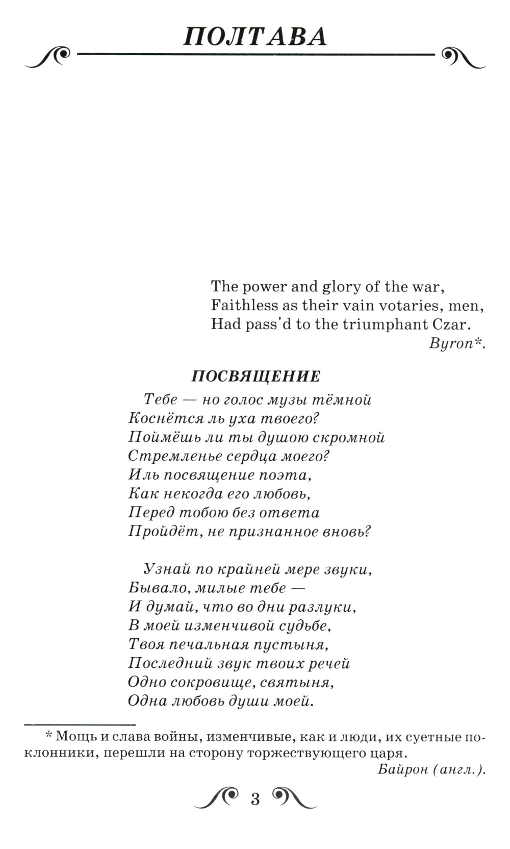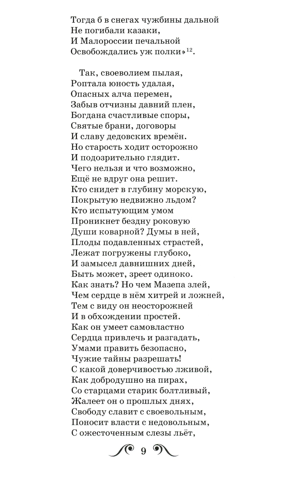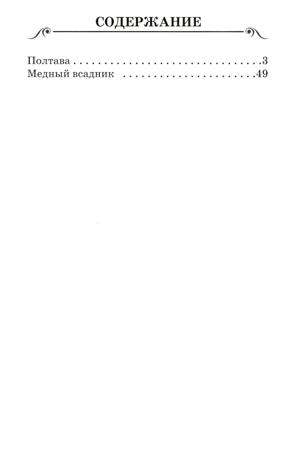 В книгу вошли известные поэмы А. С. Пушкина «Полтава» и «Медный всадник». В героической поэме «Полтава» рассказывается о победе Русской армии и императора Петра I над сильнейшей шведской армией во главе с прославленным полководцем королём Карлом XII. Полтавская битва одно из самых важных событий царствования Петра Великого, это была битва за будущность Русского государства. «Полтава» - восторженный гимн Петру I, его творческому гению, его смелой личности. Поводом к возникновению замысла поэмы «Медный всадник» послужило петербургское наводнение 1833 года. Однако поэма не просто о бунте природы, а о конфликте «маленького человека» с властью. Герой «Медного всадника» - Евгений - винит статую Петра I в своих бедах. Сам «Медный всадник» покидает постамент и гонится за оскорбителем... Произведения включены в школьную программу.| Издательство | Либри пэр бамбини |