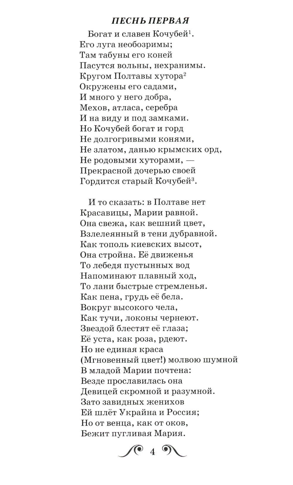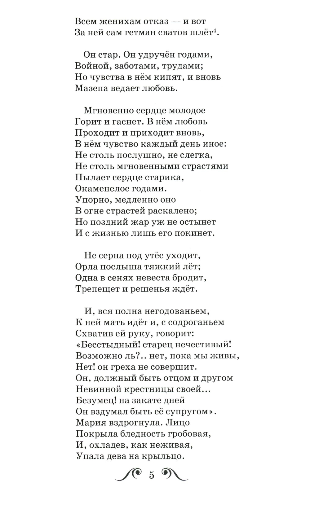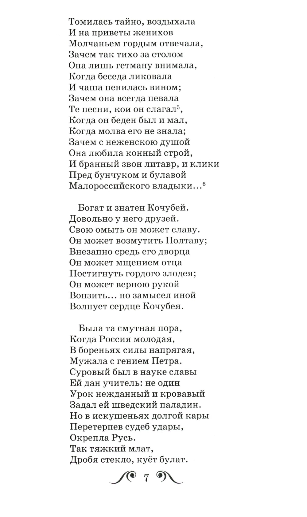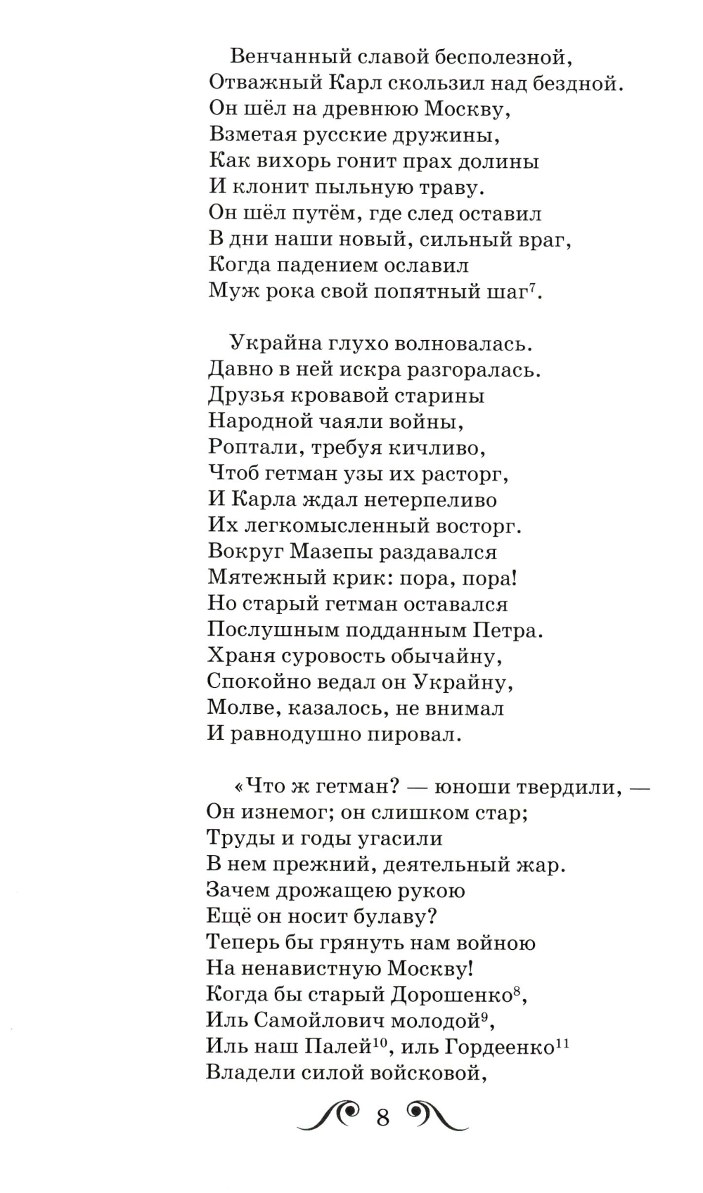 В книгу вошли известные поэмы А. С. Пушкина «Полтава» и «Медный всадник». В героической поэме «Полтава» рассказывается о победе Русской армии и императора Петра I над сильнейшей шведской армией во главе с прославленным полководцем королём Карлом XII. Полтавская битва одно из самых важных событий царствования Петра Великого, это была битва за будущность Русского государства. «Полтава» - восторженный гимн Петру I, его творческому гению, его смелой личности. Поводом к возникновению замысла поэмы «Медный всадник» послужило петербургское наводнение 1833 года. Однако поэма не просто о бунте природы, а о конфликте «маленького человека» с властью. Герой «Медного всадника» - Евгений - винит статую Петра I в своих бедах. Сам «Медный всадник» покидает постамент и гонится за оскорбителем... Произведения включены в школьную программу.| Издательство | Либри пэр бамбини |