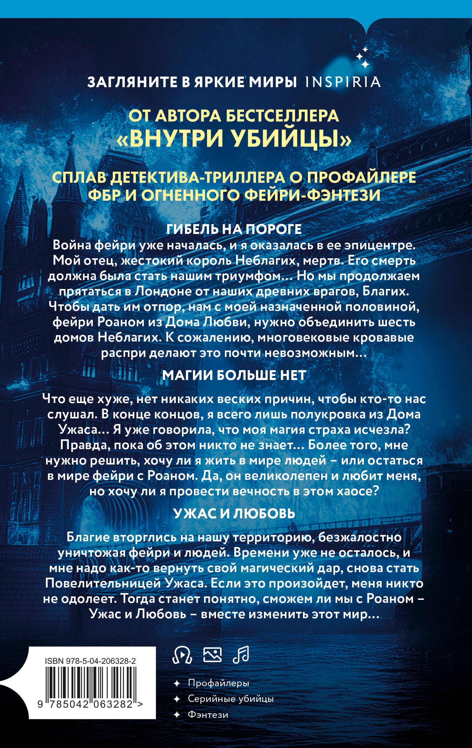 ОТ АВТОРА БЕСТСЕЛЛЕРА «ВНУТРИ УБИЙЦЫ». СПЛАВ ДЕТЕКТИВА-ТРИЛЛЕРА О ПРОФАЙЛЕРЕ ФБР И ОГНЕННОГО ФЕЙРИ-ФЭНТЕЗИ. Два самых древних чувства на земле - ужас и любовь. Они должны быть противоположны. Но на самом деле идут рука об руку… ГИБЕЛЬ НА ПОРОГЕ Война фейри уже началась, и я оказалась в ее эпицентре. Мой отец, жестокий король Неблагих, мертв. Его смерть должна была стать нашим триумфом… Но мы продолжаем прятаться в Лондоне от наших древних врагов, Благих. Чтобы дать им отпор, нам с моей назначенной половиной, фейри Роаном из Дома Любви, нужно объединить шесть домов Неблагих. К сожалению, многовековые кровавые распри делают это почти невозможным… МАГИИ БОЛЬШЕ НЕТ Что еще хуже, нет никаких веских причин, чтобы кто-то нас слушал. В конце концов я всего лишь полукровка из Дома Ужаса… Я уже говорила, что моя магия страха исчезла? Правда, пока об этом никто не знает… Более того, мне нужно решить, хочу ли я жить в мире людей - или остаться в мире фейри с Роаном. Да, он великолепен и любит меня, но хочу ли я провести вечность в этом хаосе? УЖАС И ЛЮБОВЬ Благие вторглись на нашу территорию, безжалостно уничтожая фейри и людей. Времени уже не осталось, и мне надо как-то вернуть свой магический дар, снова стать Повелительницей Ужаса. Если это произойдет, меня никто не одолеет. Тогда станет понятно, сможем ли мы с Роаном - Ужас и Любовь - вместе изменить этот мир…| Издательство | ООО "Издательство "Эксмо" |