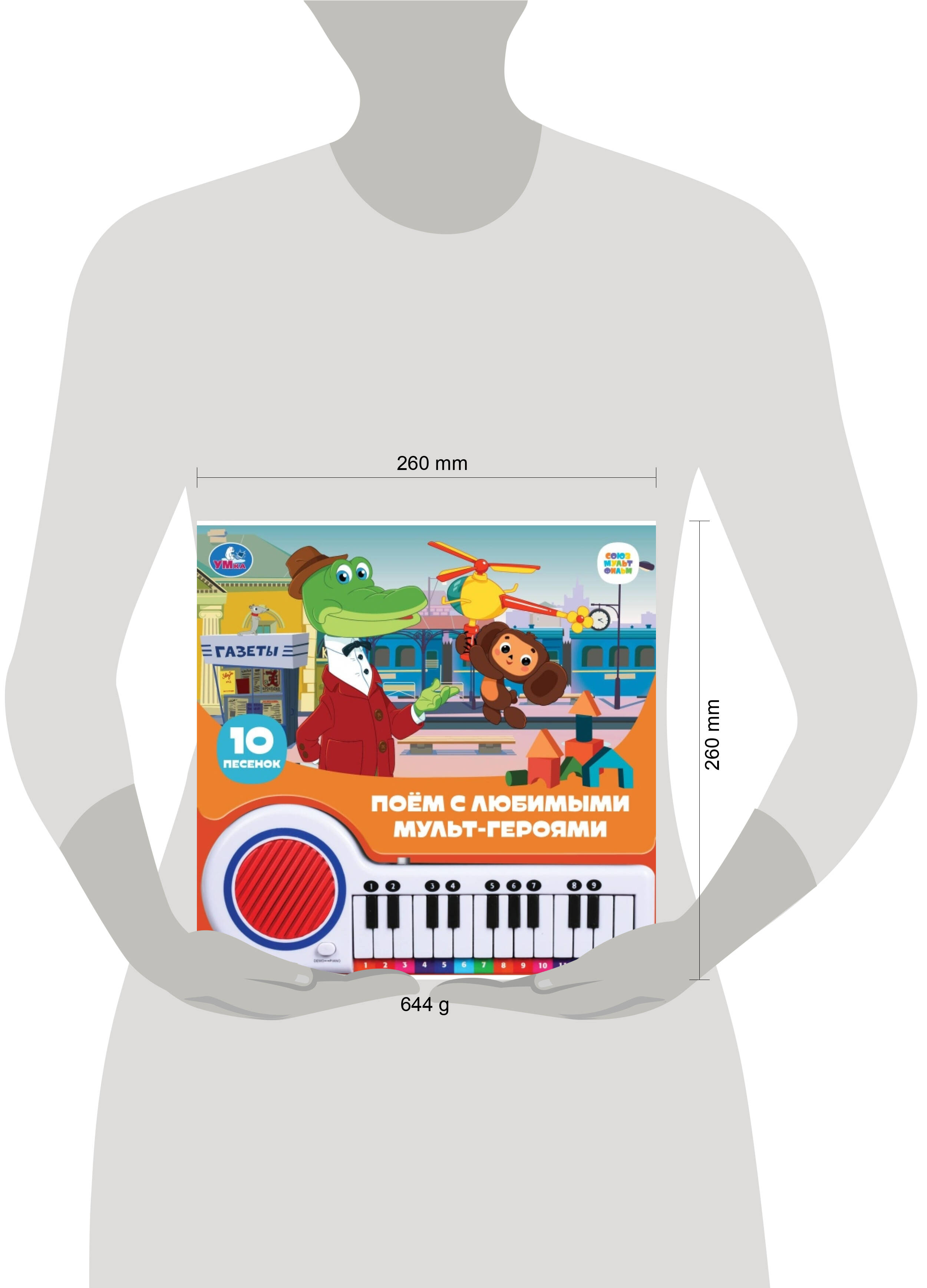 Книга-пианино "Союзмультфильм. Поём с мультгероями" ТМ "УМка" станет прекрасным подарком для малыша: - 10 любимых песен (фрагменты): "Песенка Чебурашки", "Голубой вагон", "Песня Шапокляк", "Песенка друзей" (Бременские музыканты), "Песня разбойников", "Лучший подарок" (Винни-Пух), "Песенка Умки", "Колыбельная Медведицы", "Песенка о лете", "Расскажи, Снегурочка" - тексты песенок - 23 клавиши - 2 режима работы - красочное оформление - плотные страницы - кнопка Вкл./Выкл. с возможностью регулировать громкость - режим Demo: выбери номер песни и нажми на нужную клавишу - слушай песню из мультика - режим Piano: играй мелодию самостоятельно, нажимая соответствующие нотам клавиши На каждой страничке это занимательной книги ребёнка ждут красивые иллюстрации, тексты песенок и ноты к ним. При нажатии на кнопку слева от клавиш происходит переключение на режим проигрывания песен, при втором нажатии - переключение на пианино. В режиме пианино маленький музыкант, нажимая на клавиши, сможет наиграть по нотам-подсказкам песенки из книги или придумать свои собственные мелодии. Книга сделана из плотного картона, поэтому мамы могут не опасаться, что ребёнок порвёт странички. Игра с книгой-пианино ТМ "УМка" развивает: - слуховое восприятие и музыкальный слух - фантазию - образное мышление - внимание - память - мелкую моторику Объём: 14 стр. Формат: 260 х 255 мм. Материал: пластмасса + картон. Работает от 2-х батареек типа АА (в комплекте). Рекомендовано детям старшего дошкольного возраста.| Издательство | С-Маркет ООО |