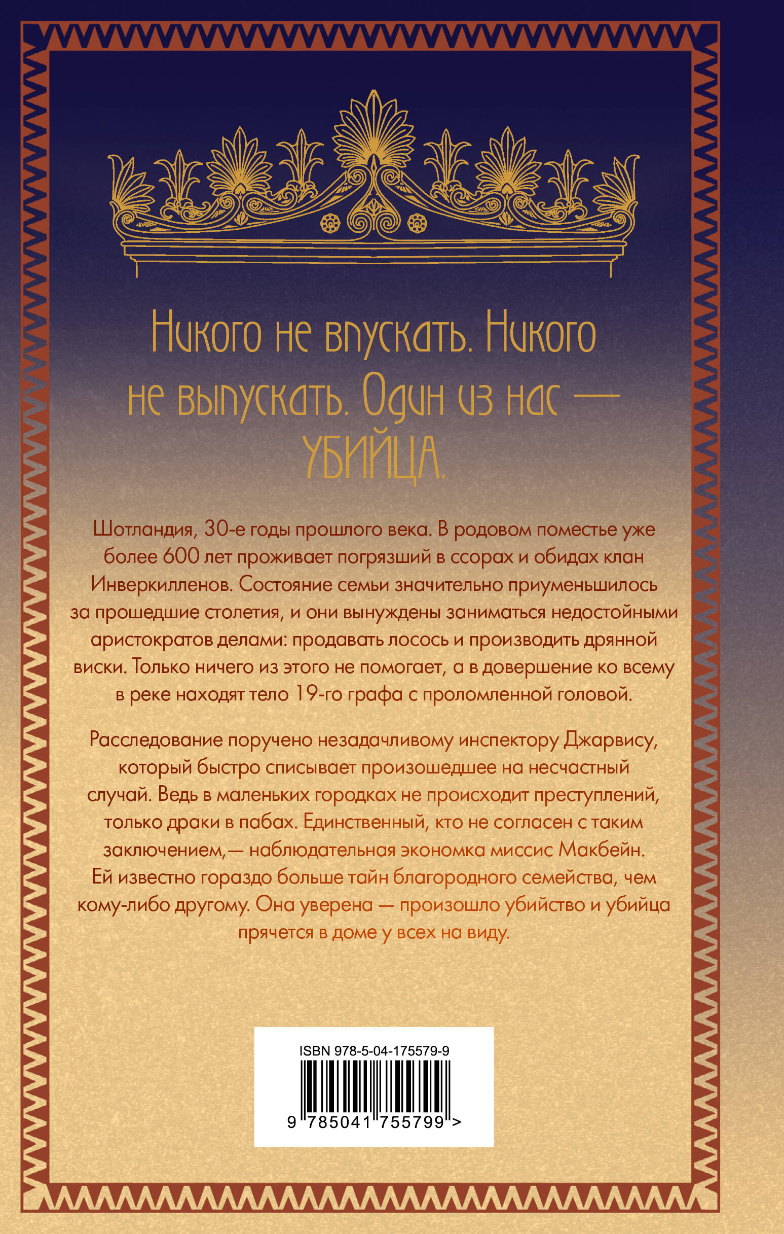 Никого не впускать. Никого не выпускать. Один из нас - убийца. Шотландия, 30-е годы прошлого века. В родовом поместье уже более 600 лет проживает погрязший в ссорах и обидах клан Инверкилленов. Состояние семьи значительно преуменьшилось за прошедшие столетия, и они вынуждены заниматься недостойными аристократов делами: продавать лосось и производить дрянной виски. Только ничего из этого не выходит, а в довершение ко всему в реке находят тело 19-го графа с проломленной головой. Расследование поручено незадачливому инспектору Джарвису, который быстро списывает произошедшее на несчастный случай. Ведь в маленьких городках не происходит преступлений, только драки в пабах. Единственный, кто не согласен с таким заключением - наблюдательная экономка миссис Макбейн. Ей известно гораздо больше тайн благородного семейства, чем кому-либо другому. Она уверена - произошло убийство и убийца прячется в доме у всех на виду. *** Бет Коуэн-Эрскин, как никто другой, знает, о чем пишет, ведь через мужа она породнилась с одним древним шотландским кланом, который и послужил источником вдохновения для этой книги. _________________________________________________________ «Занимательная история и увлекательное погружение в странные и поразительные обычаи британской аристократии». - Си Джей Беннет, автор бестселлера «Виндзорский узел»| Издательство | ООО "Издательство "Эксмо" |