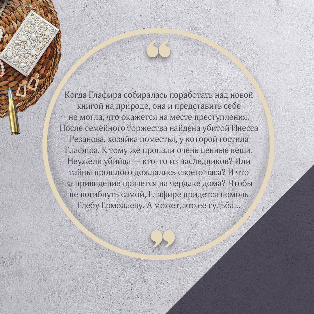 Писательница Глафира Северцева, главная героиня нового романа Людмилы Мартовой «Поместье с привидениями», оказывается втянута в странные события. Когда Глафира собиралась поработать над новой книгой на природе, она и представить себе не могла, что окажется на месте преступления. После семейного торжества найдена убитой Инесса Резанова, хозяйка поместья, у которой гостила Глафира. К тому же пропали очень ценные вещи. Неужели убийца - кто-то из наследников? Или тайны прошлого дождались своего часа? И что за привидение прячется на чердаке дома? Чтобы не погибнуть самой, Глафире придется помочь Глебу Ермолаеву. А может, это ее судьба…