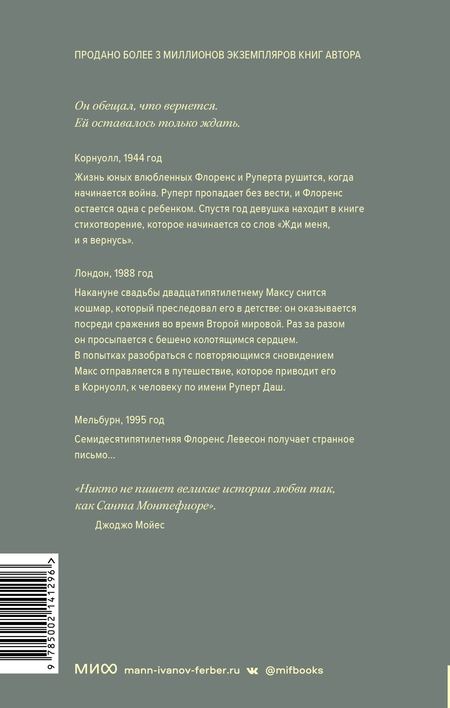 Корнуолл, 1937 год. Идиллическая жизнь юных влюбленных Флоренс и Руперта рушится, когда начинается война. Руперт погибает, и Флоренс остается одна с ребенком. Спустя год девушка находит в книге записку со словами "Жди меня, и я вернусь". Лондон, 1988 год. Двадцатипятилетний Макс переживает личный кризис. Ему все время снится странный сон; он увлекается эзотерикой и начинает подозревать, что этот сон - регрессия в его прошлую жизнь, в которой он был Рупертом. Австралия, 1995 год. 75-летняя Флоренс Левесон получает странное письмо…| Издательство | МАНН, ИВАНОВ И ФЕРБЕР ООО |