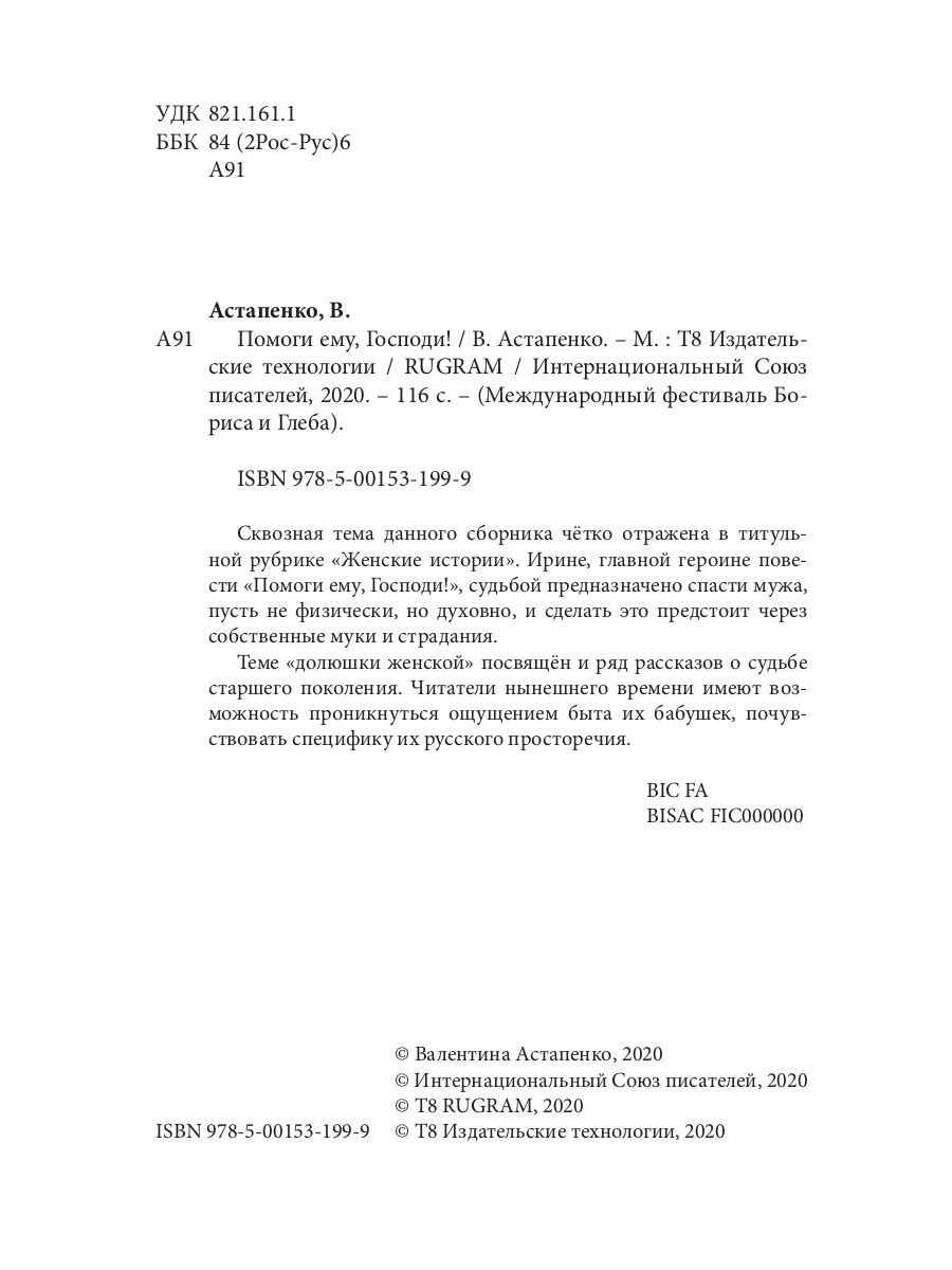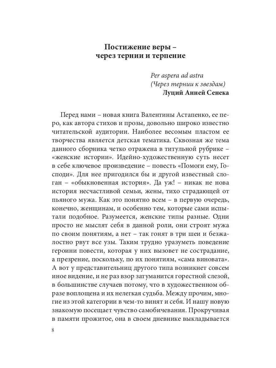 Сквозная тема данного сборника чётко отражена в титульной рубрике «Женские истории». Ирине, главной героине повести «Помоги ему, Господи!», судьбой предназначено спасти мужа, пусть не физически, но духовно, и сделать это предстоит через собственные муки и страдания. Теме «долюшки женской» посвящен и ряд рассказов о судьбе старшего поколения. Читатели нынешнего времени имеют возможность проникнуться ощущением быта их бабушек, почувствовать специфику их русского просторечия.| Издательство | Т8 RUGRAM |