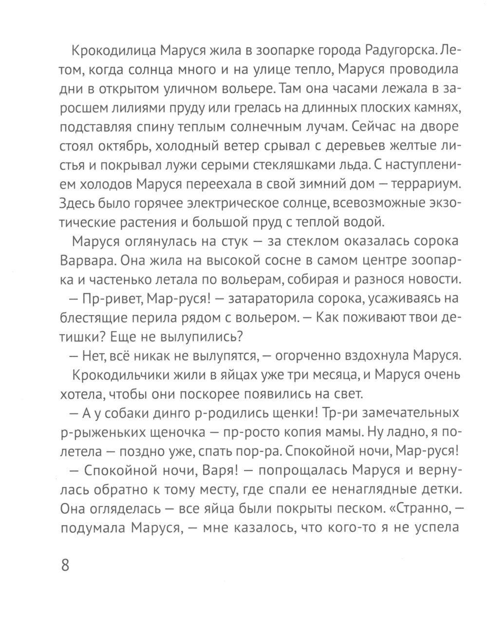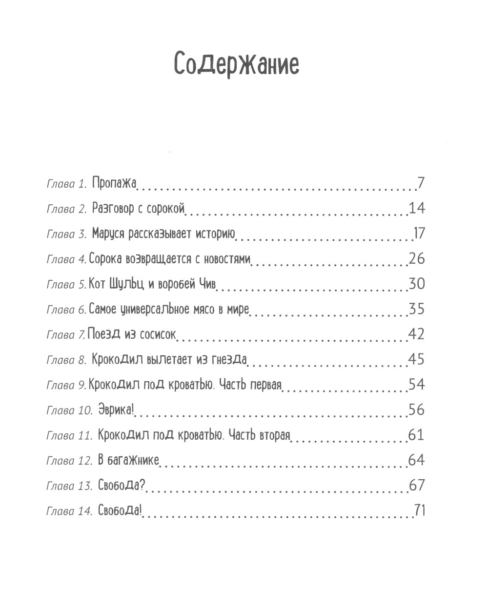 Крокодилица Маруся живет в зоопарке города Радугорска. Скоро счастливое событие: она высиживает шесть яиц и ждет не дождется, когда из них вылупятся крокодильчики. Но однажды она обнаруживает, что кто-то похитил одно из ее драгоценных яиц. Как тут не растеряться! Ведь среди подозреваемых - сорока Варя, мартышка Мотя, мартышка Катя, какаду, кукушка... Распутывать это непростое дело берутся кот Шульц и воробей Чив, а помогать (или мешать?) им будут сотрудники полиции и зоопарка. Эта запутанная история понравится всем, кто любит животных и детективы.