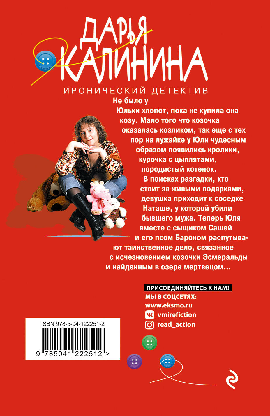 Не было у Юльки хлопот, пока не купила она козу. Мало того, что козочка оказалась козликом, так еще с тех пор на лужайке у Юли чудесным образом появились кролики, курочка с цыплятами, породистый котенок. В поисках разгадки, кто стоит за живыми подарками, девушка приходит к соседке Наташе, у которой убили бывшего мужа. Теперь Юля вместе с сыщиком Сашей и его псом Бароном распутывают таинственное дело, связанное с исчезновением козочки Эсмеральды и найденным в озере мертвецом… Все мы, женщины, немного авантюристки. Осторожны мы или импульсивны, консервативны или взбалмошны, в нашей душе всегда найдется местечко для проказ, интриг и эпатажа. Мы жить не можем без приключений! Наверное, именно поэтому иронические детективы Дарьи Калининой привлекают настоящих женщин!| Издательство | ООО "Издательство "Эксмо" |