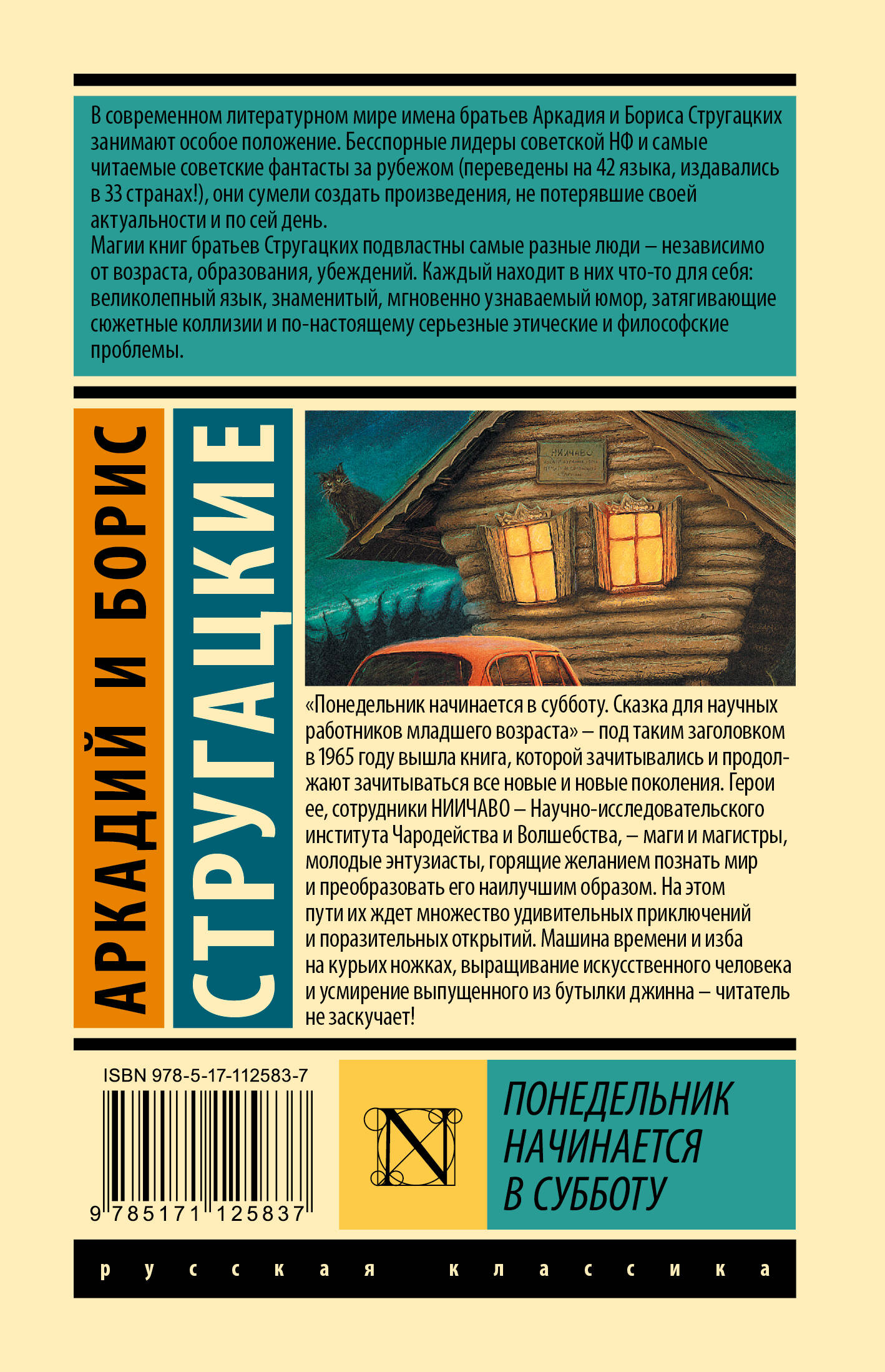 "Понедельник начинается в субботу. Сказка для научных работников младшего возраста" - под таким заголовком в 1965 году вышла книга, которой зачитывались и продолжают зачитываться все новые и новые поколения. Герои ее, сотрудники НИИЧАВО, - Научно-исследовательского института Чародейства и Волшебства, - маги и магистры, молодые энтузиасты, горящие желанием познать мир и преобразовать его наилучшим образом. На этом пути их ждет множество удивительных приключений и поразительных открытий. Машина времени и изба на курьих ножках, выращивание искусственного человека и усмирение выпущенного из бутылки джинна - читатель не заскучает!