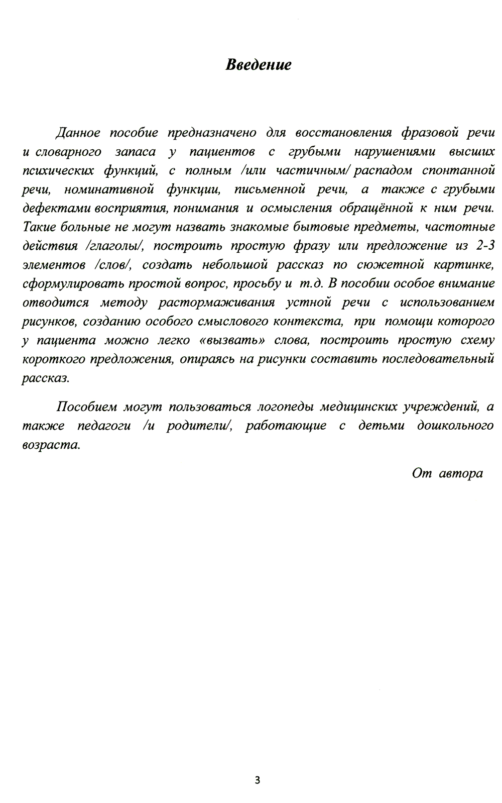 Пособие предназначено для восстановления фразовой речи и словарного запаса у пациентов с грубыми нарушениями высших психических функций, с полным (или частичным) распадом спонтанной речи, номинативной функции, письменной речи, а также с грубыми дефектами восприятия, понимания и осмысления обращенной к ним речи.